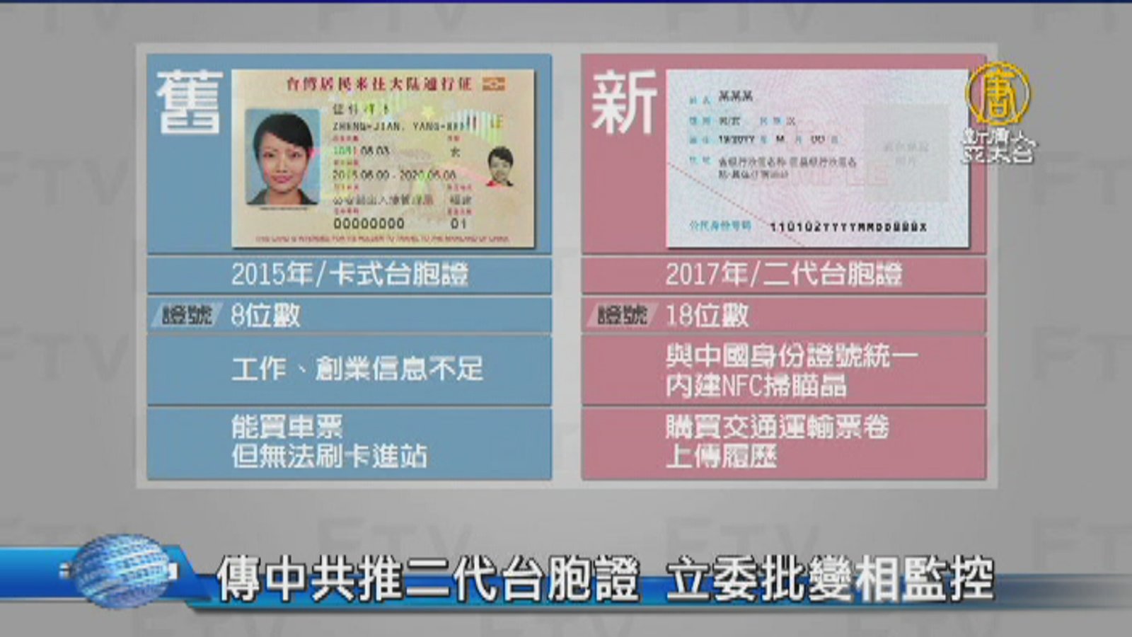 台灣民眾要到中國,必須辦理台胞證,現在傳出,中國打算推出「二代卡式台胞證」,內建掃描晶元,以方便購買交通票?,上傳履歷等功能,據傳二代卡年底就要上路。不過立委質疑,這樣是不是讓中共變相監控,台灣民眾? //asset1.ntdtv.com.tw/public/uploads/assets/2017/06/22/2017-06-22-594bc4185ecf6.mp4 台胞證|二代卡式台胞證|監控|中國身分證號|個資外洩2017-06-22 21:18:58