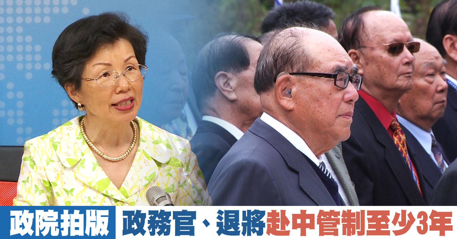 新聞頭條,先來看到,行政院拍版兩岸人民關係條例草案,針對離退公務員與軍職人員赴陸管制,年限不得低於三年,涉及機敏人員,採終身報備制。退役人員前往中國,如果損及國家尊嚴,嚴重者將剝奪領取退休俸。 //asset1.ntdtv.com.tw/public/uploads/assets/2017/07/06/2017-07-06-595e27671924f.mp4 陸委會|兩岸人民關係條例|退將2017-07-07 10:42:53