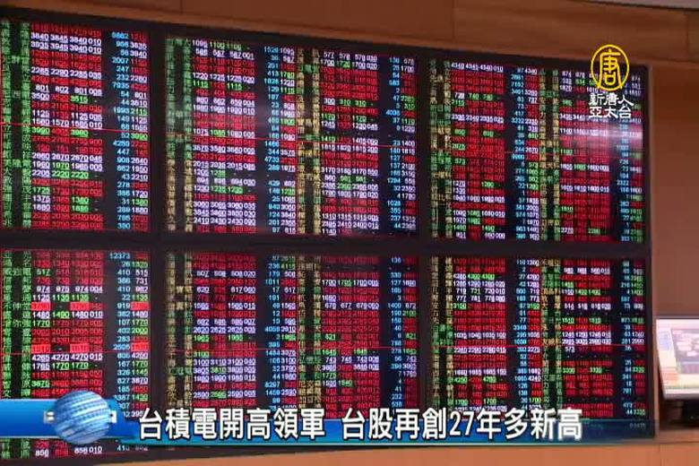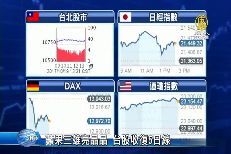 台股今天在美股大漲激勵下跳空開高,受惠於 美國進入超級財報週,IBM 股價大漲, 帶動周三道瓊指數再創歷史新高,同步激勵台股周四表現。今天在蘋概三雄:台積電、大立光與鴻海領軍下,盤中一度挑戰10800點整數關卡,收復 5 日線,終場上漲40點,收在10760點,成交值新台幣1188.16億元。而新台幣今天走勢偏貶,終場以30.23元兌1美元作收,小貶3分,創一週以來的新低。 //asset1.ntdtv.com.tw/public/uploads/assets/2017/10/19/2017-10-19-59e89548600d3.mp4 台股|上漲|蘋概股|新台幣匯率2017-10-19 20:04:02