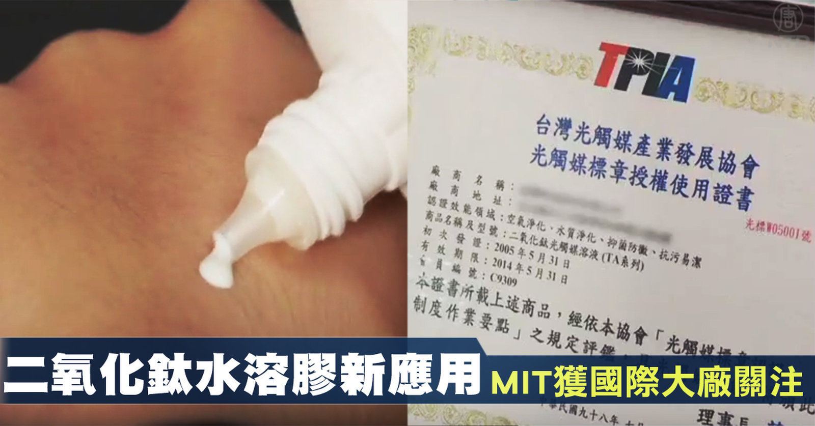 二氧化鈦俗稱鈦白粉,是一種白色顏料,無毒,不溶於水,食衣住行中,都能看得到它的存在,像是口香糖、保養品,尤其塗料使用,占最大的比例。隨著時代需求,許多廠商尋找二氧化鈦的新應用。帶您看到,在台灣,一家科技業者,花費10年投入數億元,研發成功二氧化鈦水溶膠材料合成與應用技術,也是目前全球獲得最多的專利認證,MIT技術精良,吸引不少國際科技大廠,有意入主。 //asset3.ntdtv.com.tw/public/uploads/assets/2017/10/19/2017-10-19-59e89ecc93299.mp4 二氧化鈦水溶膠|二氧化鈦|二氧化鈦水性|劉文泉|二氧化鈦水溶膠新應用2017-10-31 14:22:11