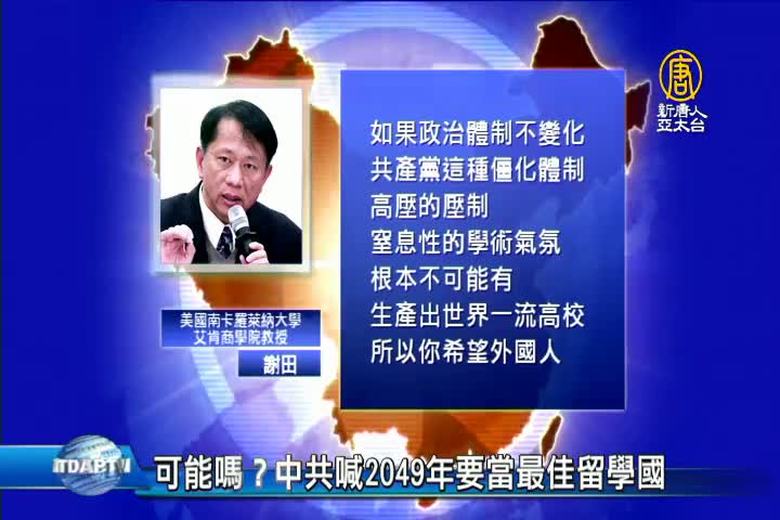 中共教育部長陳寶生出席十九大記者會時,喊出2049年中國將成為「世界上人們最嚮往的留學目的國」,不過,美國教授表示,要讓學術不受干擾,學生自由學習,中國應該先拋棄中共體制。 //asset1.ntdtv.com.tw/public/uploads/assets/2017/10/24/2017-10-24-59ef3f7e28166.mp4 中國教育|海歸|留學中國|出國留學2017-10-24 21:23:35