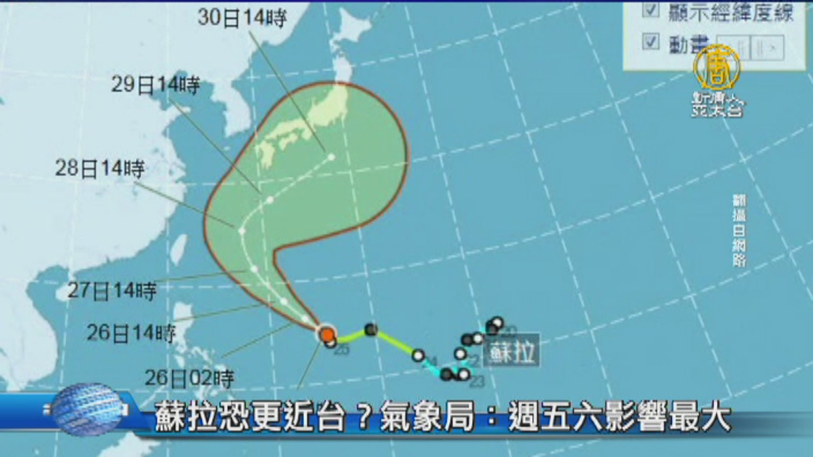 天氣似乎又變得更涼了,今年第22號颱風蘇拉昨天下午生成,目前距離鵝鑾鼻東南方1730公里的海面上,以每小時24公里速度,朝西北西前進,未來路徑有可能像蘭恩,朝東北方往日本前進,不過氣象局表示,這個星期五、星期六是蘇拉颱風最靠近台灣的時候,外圍雲系將給台灣北部、東半部帶來短暫雨,對中南部地區影響不大。不過台南以北,以及沿海地區,仍將明顯感受到風勢增強。而在蘇拉遠離後,下週一、二,會有另一道東北季風南下,到時 北部、東北部低溫將有機會下探到18度。 //asset3.ntdtv.com.tw/public/uploads/assets/2017/10/25/2017-10-25-59f080c02c5cc.mp4 蘇拉颱風|低溫|颱風2017-10-25 20:14:19