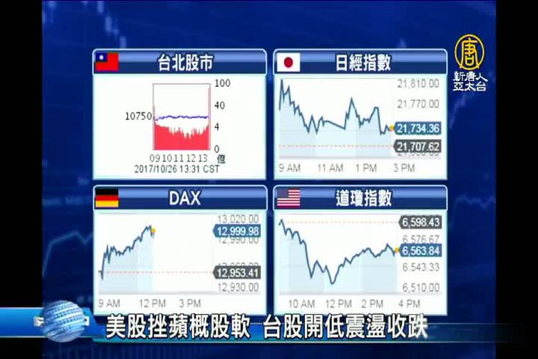 美股週三走勢疲軟,影響今天台股小跌開出,由於蘋概股三王漲跌互見,金融、傳產股權值股表現弱勢,指數一度跌破五日、十日均線,台股終場下跌15.81點,收在10734.76點,成交值新台幣1099.89億元。而新台幣今天隨亞幣升值,終場以30.229元兌1美元作收,升值3.7分,匯價連2升,並創下超過一週以來的新高。 //asset3.ntdtv.com.tw/public/uploads/assets/2017/10/26/2017-10-26-59f1cf9e0ae76.mp4 台股|蘋概股|新台幣2017-10-26 20:03:59