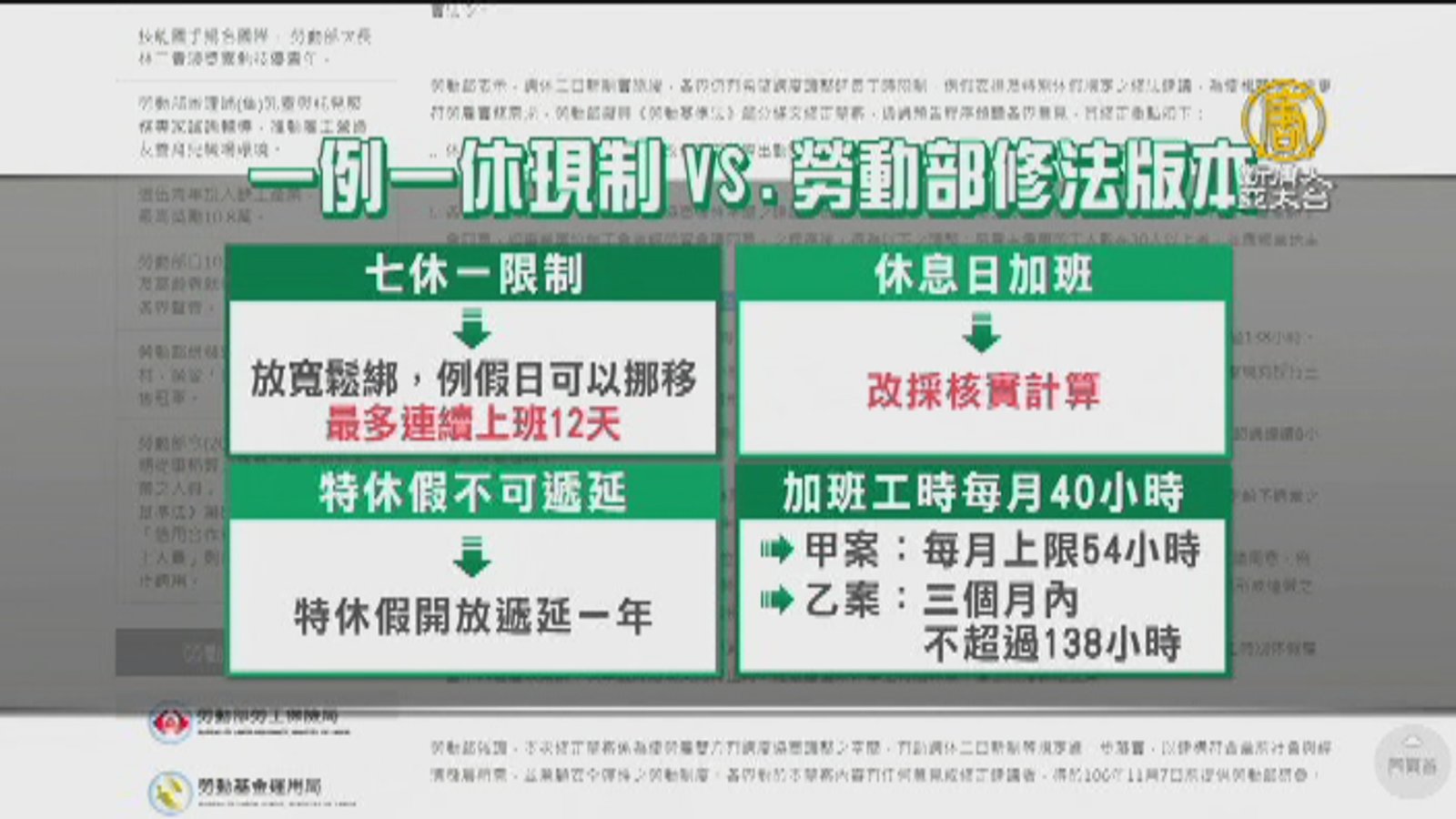 再來看到,一例一休吵了一年多,勞動部今天正式預告勞基法修正草案版本,要放寬先前的七休一、以及休息日加班費規定,工商企業界對於再次修法,普遍正面看待,希望未來修法能給產業界、勞工更多彈性,但勞團認為行政院的新版本仍有五大爭議。 //asset2.ntdtv.com.tw/public/uploads/assets/2017/10/31/2017-10-31-59f867c61f238.mp4 勞基法|一例一休|工商團體|工總|許勝雄2017-10-31 20:06:13