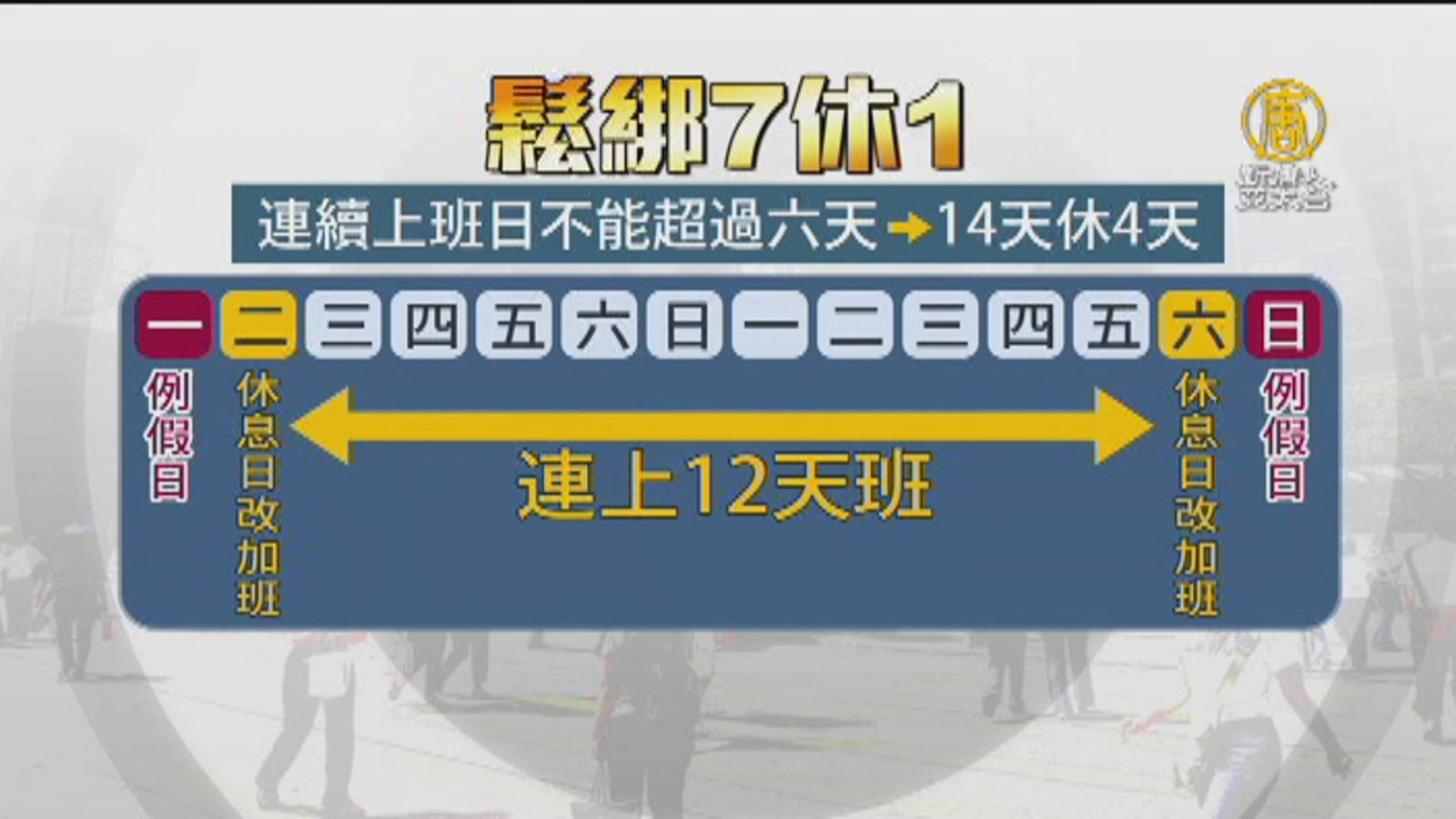 勞基法要放寬強制七休一制度,只要在14天內休4天就符合規定,如果把休息日和例假日重新編排,最多一次能連上12天班,這樣鬆綁對原本星期日不送件的快遞業者來說,是一大利多,未來不排除週日恢復送貨。 //asset2.ntdtv.com.tw/public/uploads/assets/2017/10/31/2017-10-31-59f867fae836d.mp4 一例一休|勞工|12天班|七休一|快遞2017-10-31 20:08:08