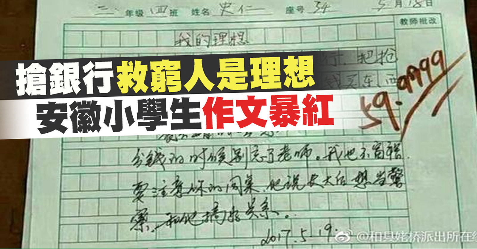 搶銀行救窮人是理想 安徽小學生作文暴紅|中國一分鐘