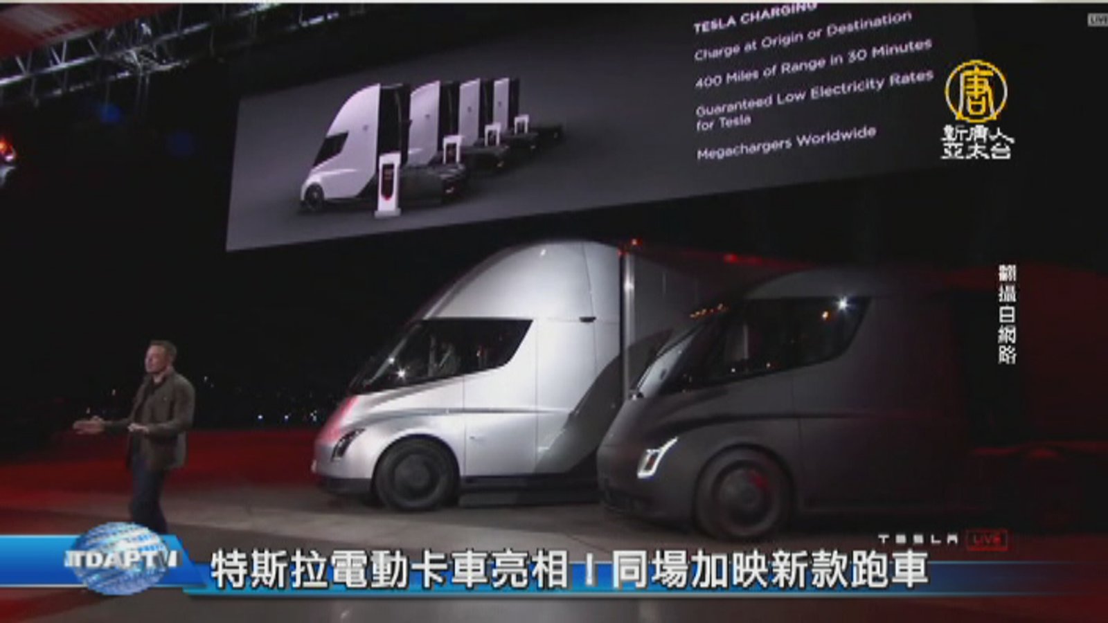 科技趨勢新聞,來看到,原本計劃在九月發表的特斯拉電動半掛卡車,終於在美國周四晚上,也就是台灣時間17號中午,正式亮相,同場加映的,還有特斯拉的新一代電動跑車,號稱全球最快。 //asset2.ntdtv.com.tw/public/uploads/assets/2017/11/17/2017-11-17-5a0ed93e5f084.mp4 特斯拉|Tesla|電動卡車|跑車2017-11-17 20:59:37