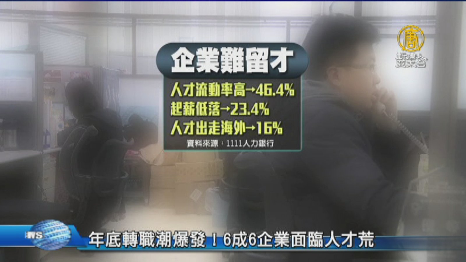 年底轉職潮爆發,人力銀行調查,有6成6企業感受到人才荒的壓力,其中人才流動率高,起薪低落,都是主要原因,因此有科技公司,祭出比同業高的薪資福利,以及良好的晉升管道,希望能留住人才,降低離職率。 //asset3.ntdtv.com.tw/public/uploads/assets/2017/11/22/2017-11-22-5a1577c38d6d3.mp4 人力銀行|徵才|出走|加薪|離職率2017-11-22 21:09:40