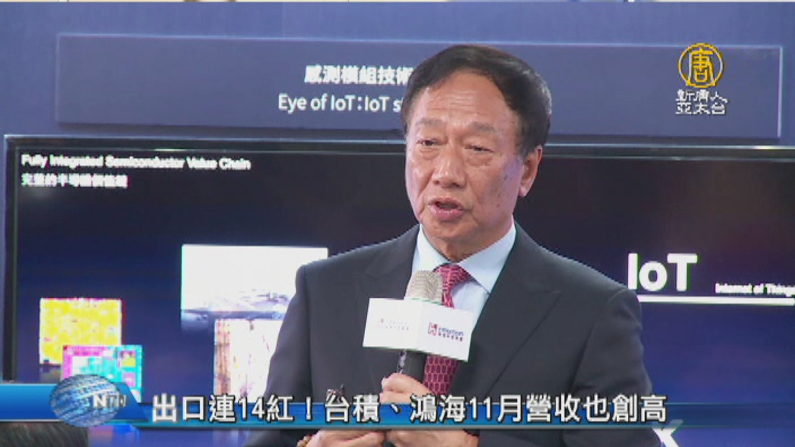 新聞一開始,帶您看到,財政部公布11月出口數據,表現超出預期,出口達288.8億美元,年增14%,增幅重回雙位數水準,並且是連續14個月正成長。財政部分析,全球景氣穩定向上,加上行動裝置新品帶動,出口表現可說氣勢如虹。除此之外,鴻海也公布11月合併營收,創單月業績歷史新高紀錄,台積電方面,11月的部分,雖然較10月滑落,不過,依然是單月業績,歷史次高水準,表現也相當優異。 //asset3.ntdtv.com.tw/public/uploads/assets/2017/12/08/2017-12-08-5a2a80c0ae1d2.mp4 出口|財政部|景氣|台積電|鴻海2017-12-08 20:04:44