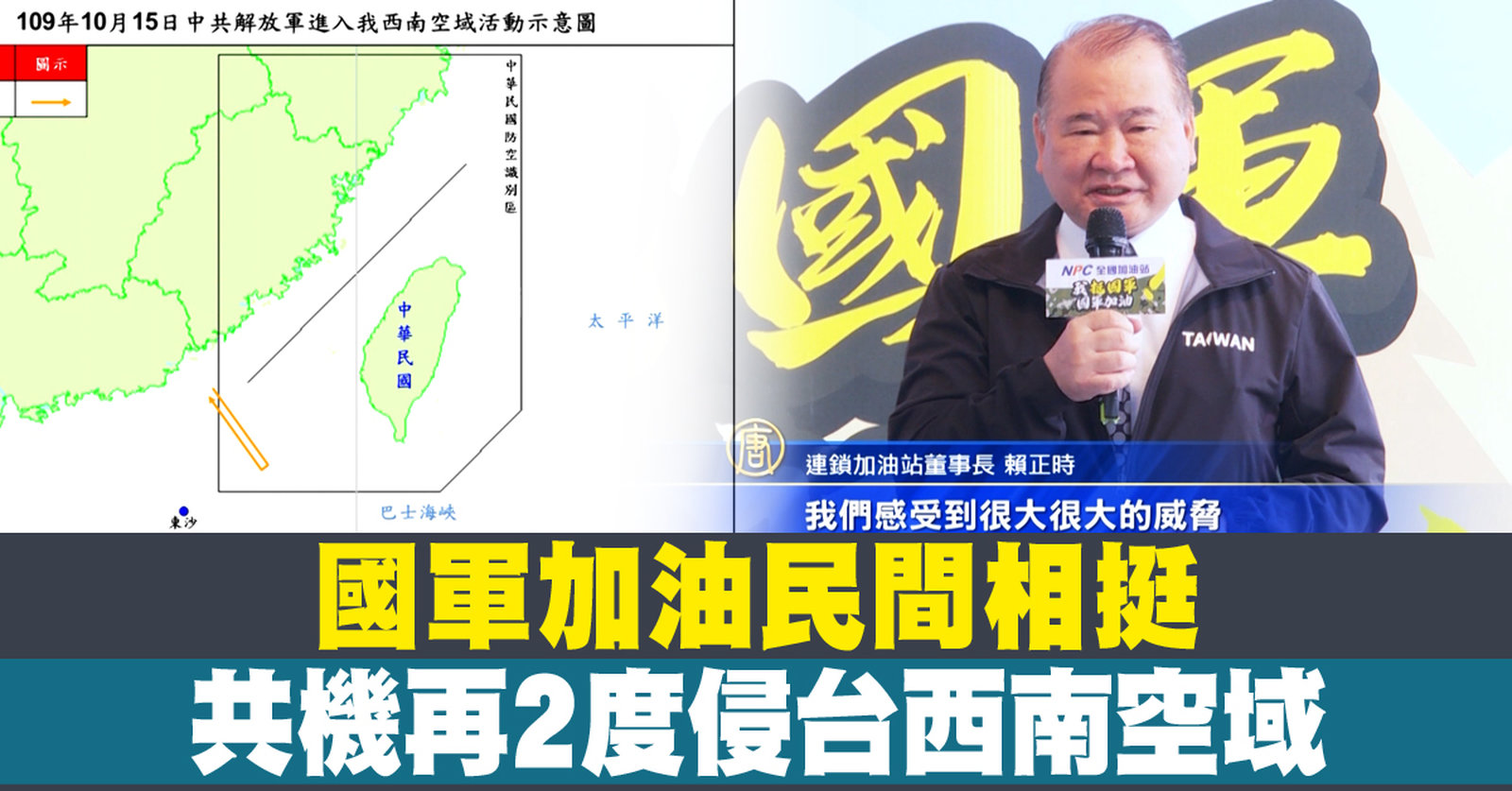 再來看到,共機頻頻擾台,傳出在20小時內,3度入侵台灣西南空域,不過截至截稿,國防部只證實昨晚及上午都有運8反潛機,兩度侵犯我國ADIZ西南角,空軍除了派遣空中巡邏兵力應對外,也實施廣播驅離、防空飛彈追蹤監控,而面對共軍不斷威脅台海安全,台灣民間發起挺國軍活動,連鎖加油站推出加油優惠,以實際行動,感謝國軍日夜保衛國家安全。 //asset2.ntdtv.com.tw/public/uploads/assets/2020/10/16/2020-10-16-5f898f0a09051.mp4 全國家油站|挺國軍|共機|賴正時|羅致政|軍售2020-10-16 20:15:01
