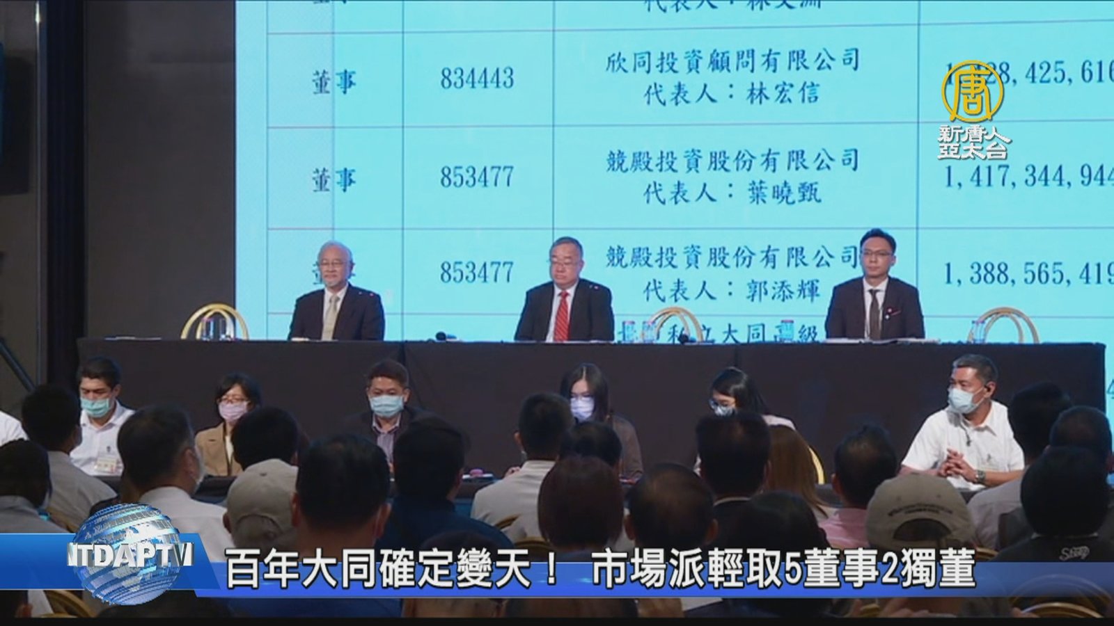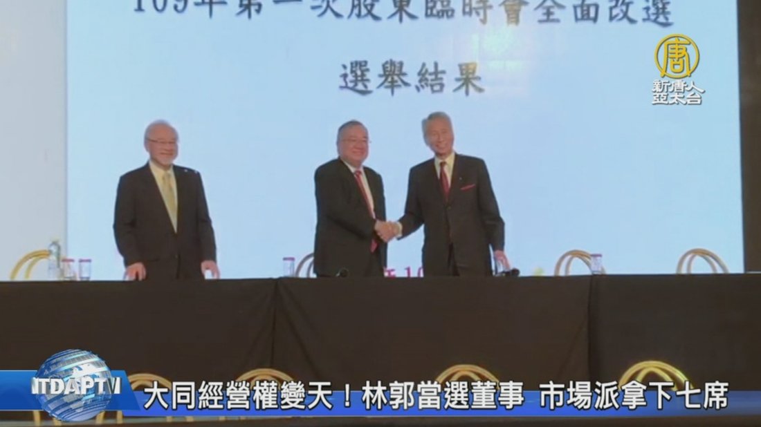 產業焦點,來看到,老字號的大同公司,週三上午9時,準時舉行股東臨時會,重新改選9席董事,由於本次由市場派欣同公司主導,沒有再出現「黑衣人」阻擋事件,投票結果上午出爐,不出意外,由市場派大獲全勝,取得共計7席董事,明顯過半,也代表百年大同正式變天。 //asset1.ntdtv.com.tw/public/uploads/assets/2020/10/21/2020-10-21-5f9027df7d475.mp4 大同|經營權之爭|王光祥|林郭文艷|林文淵2020-10-22 21:24:03