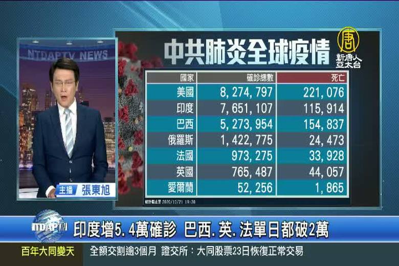 歡迎回來,來關心中共肺炎疫情最新情況,全球公開數據,累計確診超過4千081萬人,死亡1百12萬5千多人。但中共、伊朗等國家,被認為嚴重低報數據。美國方面,確診超過8百27萬4千多例、死亡22萬1千多人。印度新增5萬4千多起確診,累計超過7百65萬例。巴西與法國的單日確診病例,都再次突破2萬人。英國也新增2萬1千多例,新增241個死亡病例是前一天的3倍多。英國首相強生宣布,曼徹斯特23日起,疫情警報等級將提升到「非常高」。愛爾蘭總理馬丁20日發出全國「禁足令」,率先成為歐盟恢復全國防疫封鎖措施的國家。 //asset2.ntdtv.com.tw/public/uploads/assets/2020/10/21/2020-10-21-5f902fec7feba.mp4 美國|印度|巴西|法國|英國|曼徹斯特|愛爾蘭中共肺炎|武漢肺炎|疫情|防疫|中共病毒|新型冠狀病毒2020-10-21 20:52:36