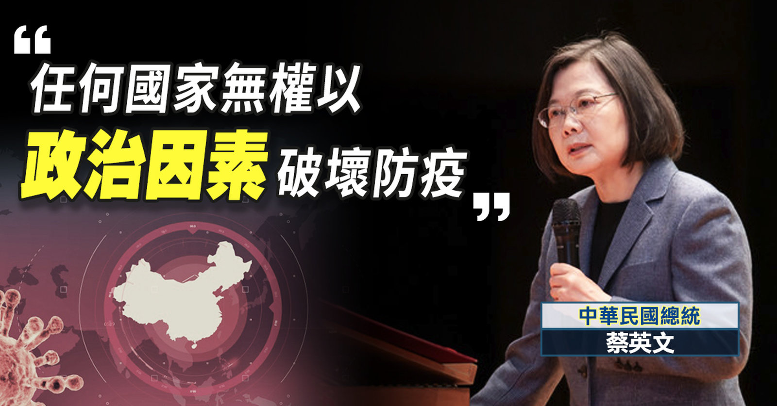 總統蔡英文今天出席「2020台灣全球健康論壇」,致詞時指出,全球遭受疫情威脅,台灣穩定防疫的同時也協助有需要的國家,而台灣位處印太地區樞紐,在防疫體系中扮演關鍵角色,任何國家都沒有權力以政治因素破壞全球防疫。 //asset2.ntdtv.com.tw/public/uploads/assets/2020/10/23/2020-10-23-5f92cffe7e05f.mp4 2020-10-23 20:38:56