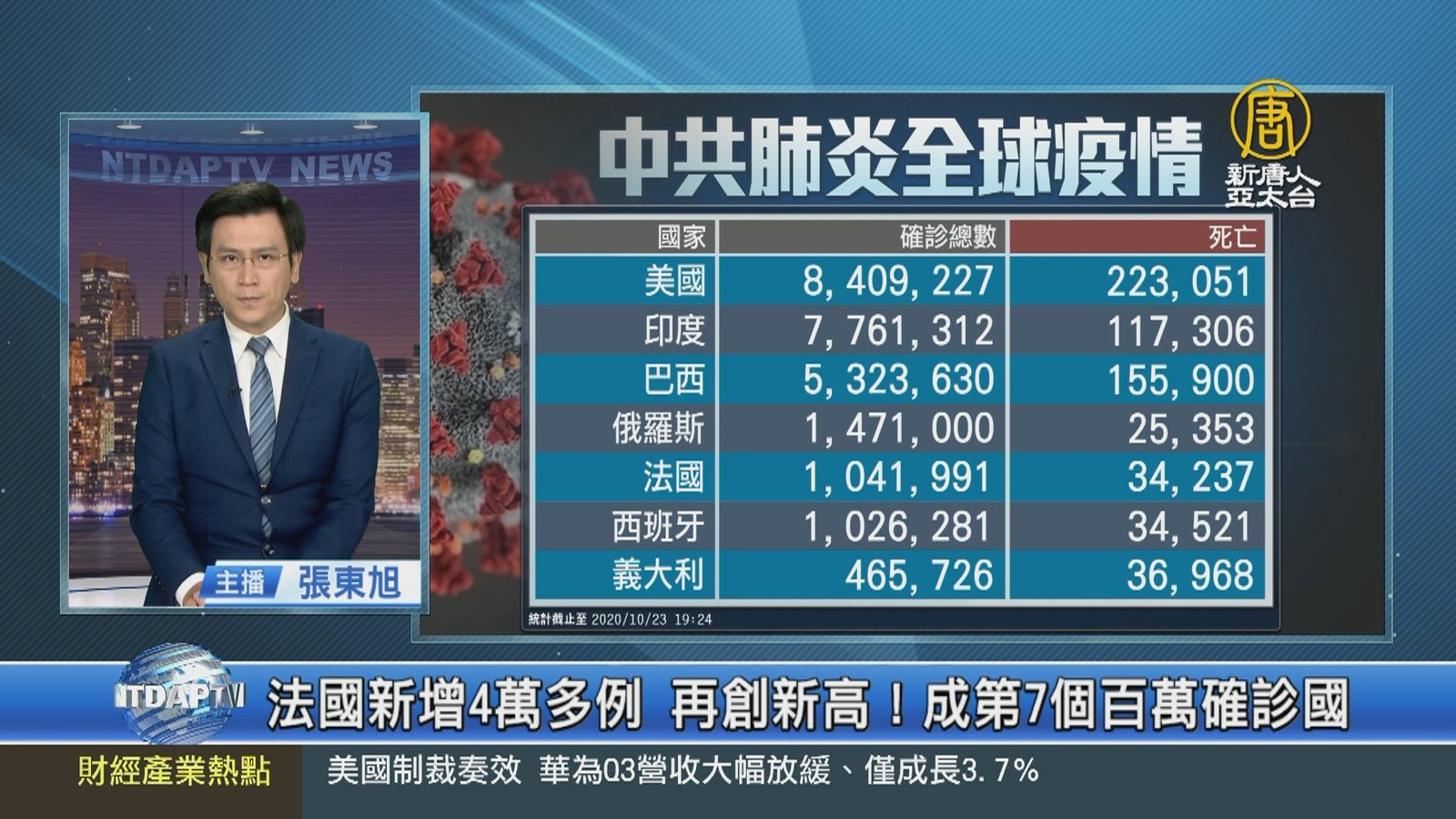 歡迎回來,中共肺炎疫情延燒,來關心最新情況,全球累計確診超過4千1百73萬人,1百13萬7千多人死亡。但中共、伊朗等國家,被認為嚴重低報數據。美國確診超過8百40萬9千例、死亡22萬3千多人。印度新增確診5萬4千多例,累計達7百76萬1千多例。歐洲病例再度攀升,西班牙新增將近2萬1千例確診,法國則是新增了4萬1千多例確診,雙雙創下疫情爆發以來單日最高紀錄,而法國也是繼西班牙之後,全球第7個累計確診達「百萬級」的國家,全法國54個行政區及法屬玻里尼西亞實施宵禁,估計約4千6百萬人受到影響。義大利也新增了1萬 //asset1.ntdtv.com.tw/public/uploads/assets/2020/10/23/2020-10-23-5f92cec987399.mp4 法國|確診|百萬級|美國|歐洲|印度|西班牙|中共肺炎|武漢肺炎|疫情|防疫|中共病毒|新型冠狀病毒2020-10-23 20:37:22