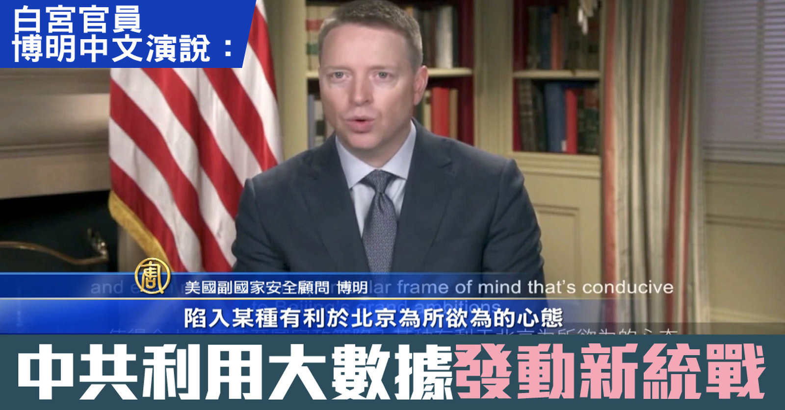 週五,美國副國家安全顧問博明,在英國智庫「政策交流」用中文發表演說,闡述中共治下的中國與世界各國的關係。他表示數字時代下,中共發動新統戰策略,利用大數據干預外國政府政策。 //asset1.ntdtv.com.tw/public/uploads/assets/2020/10/24/2020-10-24-5f941a9407479.mp4 美國副國家安全顧問|博明|中文演說|中共|統戰|大數據|干預|外國政策|迫害2020-10-24 23:33:21