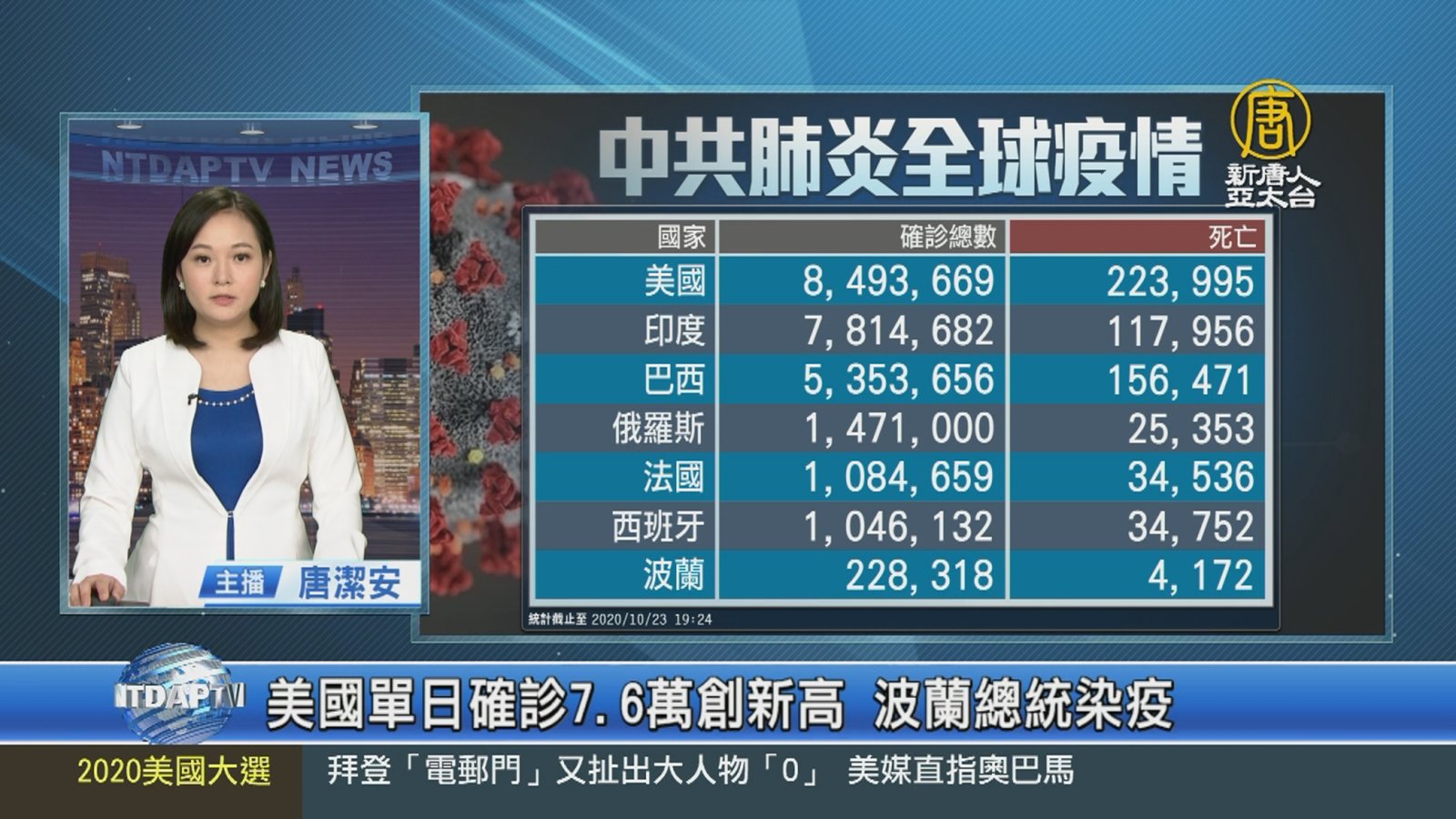 來關心中共肺炎疫情最新情況,全球累計確診超過4千2百23萬人,1百14萬4千多人死亡。但中共、伊朗等國家,被認為嚴重低報數據。美國確診超過8百49萬3千例、死亡將近22萬4千人。美國23日新增超過7萬6千起確診,是疫情爆發以來第二高,其中德州新增的病例最多,有6千8百多例。印度新增5萬3千多例確診。西班牙累計確診達1百04萬6千多例,但總理桑傑士表示,實際確診總數可能超過3百萬例。法國新一波疫情的擴散速度,快過春季第一波疫情的高峰期。法國總統馬克宏表示,可能會延長宵禁。波蘭總統杜達與斯洛維尼亞外交部長洛迦 //asset3.ntdtv.com.tw/public/uploads/assets/2020/10/24/2020-10-24-5f9424ef533fa.mp4 美國|歐洲|西班牙|法國|波蘭總統|斯洛維尼亞外交部長|確診|中共肺炎|武漢肺炎|疫情|防疫|中共病毒|新型冠狀病毒2020-10-24 20:54:01