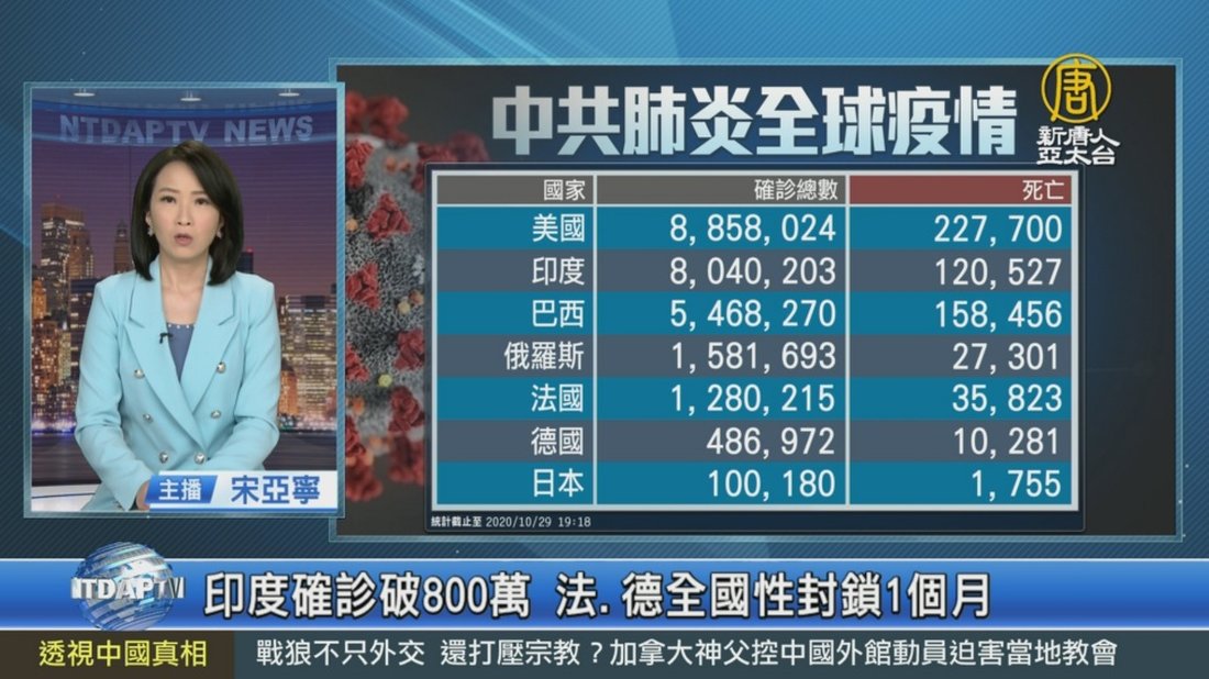 來關心中共肺炎疫情最新情況,全球累計確診超過4千4百52萬人,1百17萬4千多人死亡。但中共、伊朗等國家,被認為嚴重低報數據。印度再增4萬9千多例確診,累積超過8百04萬例。歐洲疫情持續惡化,歐洲前兩大經濟體德國和法國為防止病毒進一步擴散,分別將在11月2日和10月30日起實施全國性封鎖措施,為期至少一個月。俄羅斯16個地區情況危急,波蘭單日確診人數創新高,比利時、匈牙利、俄羅斯及波蘭病床告急。日本疫情有升溫跡象,新增306人確診,累積超過10萬人。太平洋馬紹爾群島證實2名確診,不再是全球少數沒有疫情的國 //asset2.ntdtv.com.tw/public/uploads/assets/2020/10/29/2020-10-29-5f9ab4c545e34.mp4 美國|歐洲|印度|法國|德國|日本|俄羅斯|中共肺炎|武漢肺炎|疫情|防疫|中共病毒|新型冠狀病毒2020-10-29 20:25:09