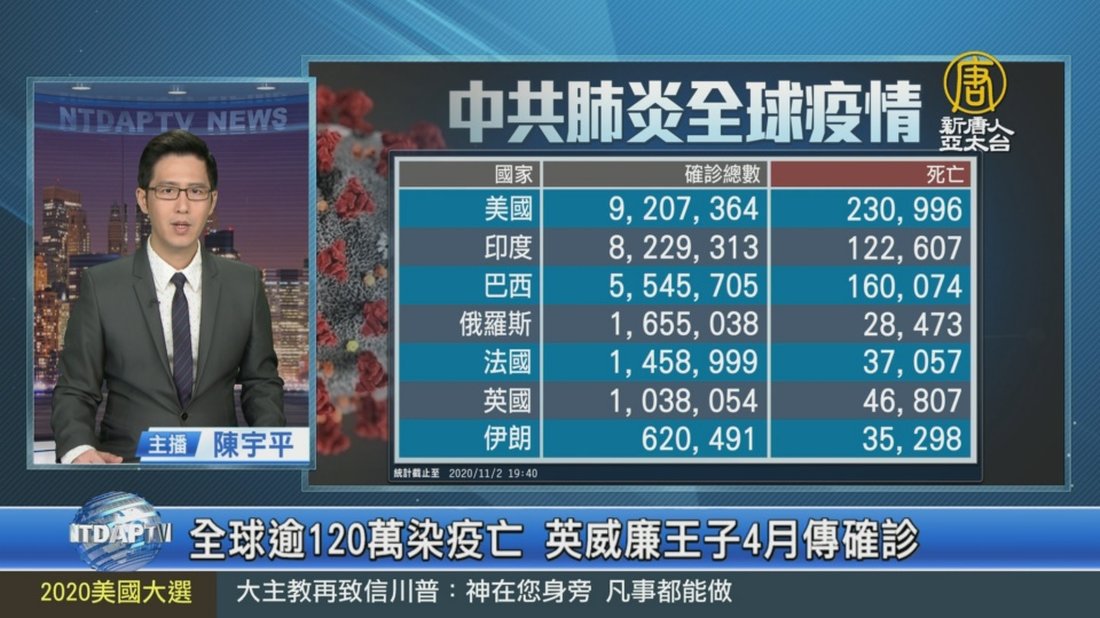 再來關心中共肺炎疫情最新情況,全球累計確診超過4千6百54萬人,1百20多萬人死亡。美國確診達到9百20萬7千多例,中西部連續第六天住院人數破紀錄,10月全美有31州新增個案增幅破紀錄。印度確診新增4萬5千多例。法國新增4萬6千多例。英國新增2萬3千多起,威廉王子4月傳出也曾確診,但沒有對外公布,首相強生宣布,英格蘭地區從5日起實施禁足令一個月。被認為嚴重低報數據的伊朗官方通報,新增7千7百多例確診,死亡病例更創下新高,但伊朗當局表示,實際死亡人數可能更高。 //asset2.ntdtv.com.tw/public/uploads/assets/2020/11/02/2020-11-02-5f9ffe85b60e3.mp4 美國|英國|威廉王子|確診|法國|伊朗|印度|中共肺炎|武漢肺炎|疫情|防疫|中共病毒|新型冠狀病毒2020-11-02 20:40:12