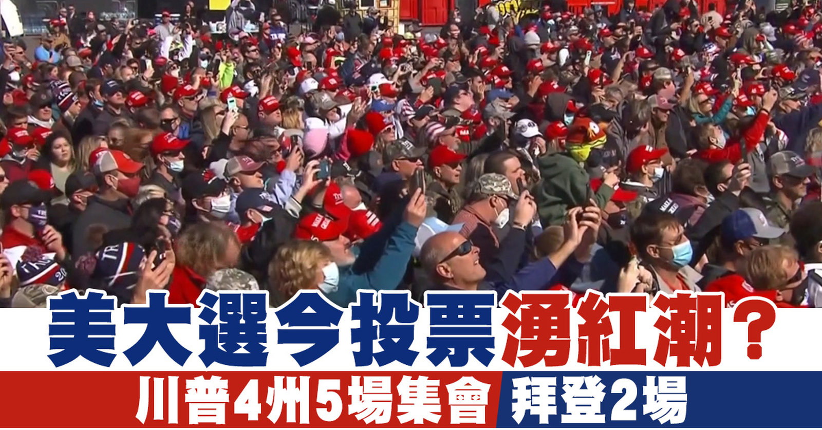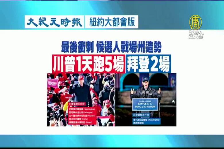 美國大選前最後一天,美國總統川普安排了5場造勢,穿梭在4個州之間;拜登則是固守賓州。根據最新整合民調,川普在關鍵搖擺州北卡羅來納州,已經以47.8%比47.6%,反超拜登。另外,這次可能創下百年來最高投票率,目前已經有超過1億選民提前投票,打破歷史紀錄。但多個搖擺州的提前投票率仍低於平均,或許會對川普有利。 //asset2.ntdtv.com.tw/public/uploads/assets/2020/11/03/2020-11-03-5fa149be72cdb.mp4 2020美國大選|川普|賓州|佛州|搖擺州2020-11-03 20:13:19