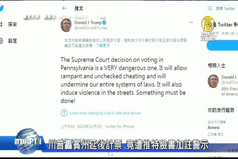 美國投票點橫跨6個時區,影響大選的,還有計票的截止時間,就在大選前,美國聯邦最高法院(The US Supreme Court )上週裁決,賓州(Pennsylvania)和北卡羅來納州(North Carolina),收受郵寄選票的截止日,可從3日總統大選日往後延長3天。這也引發美國總統川普,在推特上抨擊,質疑最高法院的裁決非常危險,會讓猖狂且不受限制的舞弊發生,破壞整個法務體系,沒想到貼文卻被推特加註「內容具有爭議」「可能誤導他人」的警示。川普在臉書上的發文,也被標示為「誤導」。 //asset1.ntdtv.com.tw/public/uploads/assets/2020/11/03/2020-11-03-5fa152e940143.mp4 2020美國大選|川普|開票|拜登2020-11-03 20:51:42