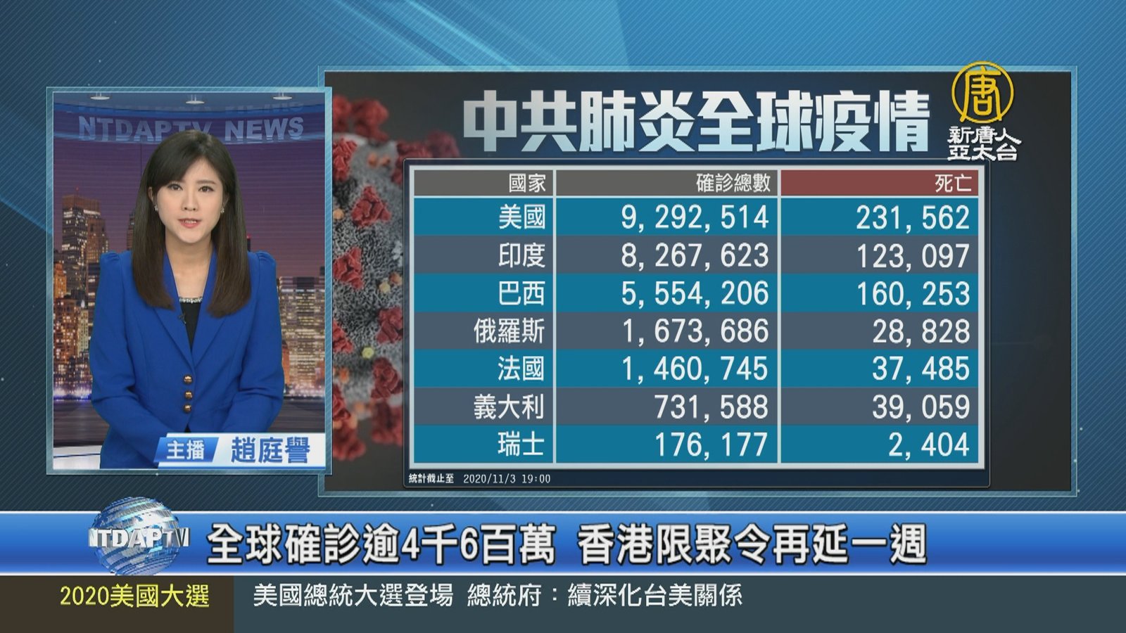 來關心中共肺炎疫情最新情況,全球累計確診超過4千6百91萬人,將近1百20萬7千人死亡。但中共、伊朗等國家,被認為嚴重低報數據。美國確診達到9百29萬2千多例。印度新增3萬8千多例確診,累計達8百26萬7千多例。俄羅斯新增1萬8千多起。歐洲第二波疫情持續擴散,義大利總理孔蒂宣布,加強封鎖措施。瑞士日內瓦全市進入緊急狀態。香港再現1起確診源頭不明感染,限聚令再延一週。 //asset1.ntdtv.com.tw/public/uploads/assets/2020/11/03/2020-11-03-5fa14e1f45fe0.mp4 美國|歐洲|印度|義大利|俄羅斯|香港|中共肺炎|武漢肺炎|疫情|防疫|中共病毒|新型冠狀病毒2020-11-03 20:32:04