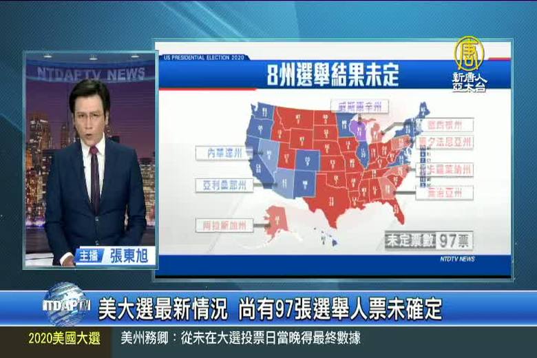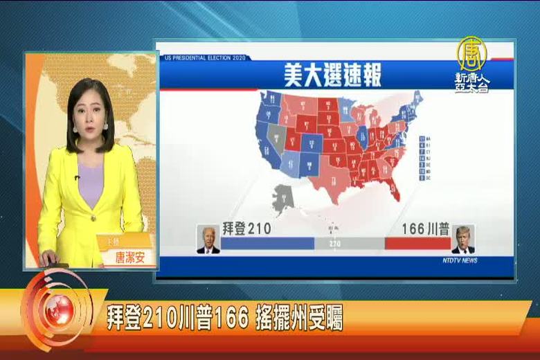 新聞先來關心,國際頭條消息,美國第59屆總統大選,最新開票情況。首先來看到雙方的普選票,截至臺灣晚間7點50分,川普獲得6698萬7853張普選票,拜登則獲得6929萬1768張普選票。在選舉人票方面,拜登獲得227張,川普則有213張。目前,選舉結果未定的除了賓夕法尼亞州、密西根州、北卡羅萊納州、亞利桑那州、威斯康辛州等5個搖擺州之外,還有喬治亞州、內華達州和阿拉斯加州。這些還沒有確定的州,共有97張選舉人票。 //asset1.ntdtv.com.tw/public/uploads/assets/2020/11/04/2020-11-04-5fa299d92471d.mp4 2020美國大選|川普2020-11-04 20:08:12