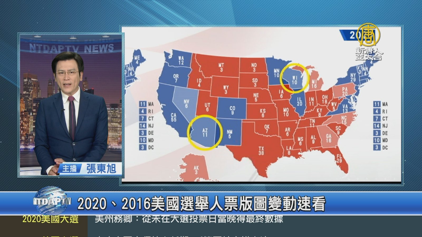 美國大選局勢,目前僵持在川普213票,拜登238張票,帶您看到五個尚未開完票的關鍵搖擺州,其中威斯康辛州早先翻盤,拜登暫時領先0.3個百分點,其餘四州仍由川普保持領先。 //asset3.ntdtv.com.tw/public/uploads/assets/2020/11/04/2020-11-04-5fa2ac9f6313e.mp4 2020美國大選|選舉舞弊|選舉詐欺|選舉訴訟|川普|拜登|郵寄選票|搖擺州2020-11-13 22:58:44
