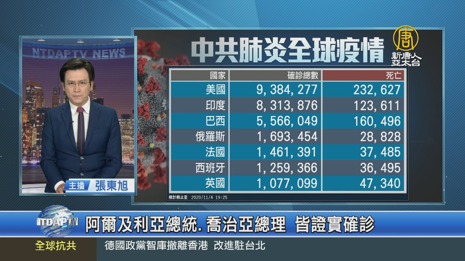 再來關心中共肺炎疫情最新情況,全球累計確診超過4千7百42萬人,1百21萬4千多人死亡。但中共、伊朗等國家,被認為嚴重低報數據。美國確診達到9百38萬4千多例。印度新增4萬6千多例確診,累計達8百31萬3千多例。歐洲確診突破1千1百萬例,奧地利和希臘再度實施封鎖措施。英國利物浦本週起實施全面篩檢。俄羅斯、伊朗、烏克蘭單日確診都再創新高。另外,阿爾及利亞總統 塔布納,喬治亞總理 加哈里亞及經濟部長 特爾納瓦都證實確診。 //asset2.ntdtv.com.tw/public/uploads/assets/2020/11/04/2020-11-04-5fa2a46d47f6d.mp4 美國|歐洲|印度|阿爾及利亞總統|喬治亞總理|確診|中共肺炎|武漢肺炎|疫情|防疫|中共病毒|新型冠狀病毒2020-11-04 20:53:10