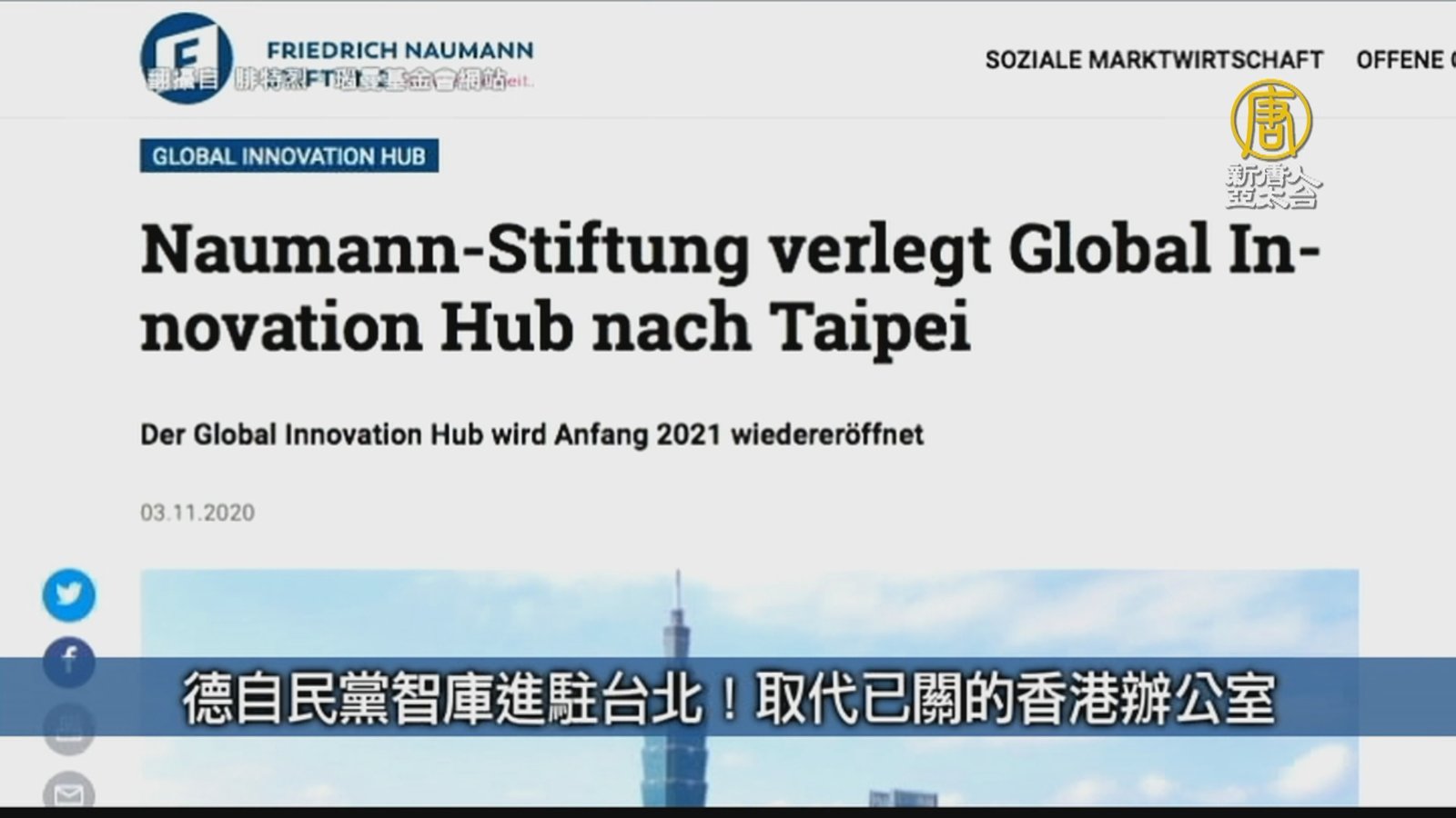 德國智庫弗里德里希.瑙曼基金會(Friedrich Naumann Foundation)是德國自由民主黨(FDP)旗下智庫,日前因港區國安法被迫離開香港,3日宣布改在台北建立據點,重啟「全球創新中心」,預計明年年初揭牌。 //asset2.ntdtv.com.tw/public/uploads/assets/2020/11/04/2020-11-04-5fa2a6dfa9883.mp4 2020-11-04 21:11:56