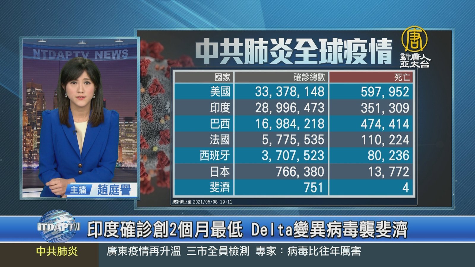歡迎回來,來關心中共肺炎疫情最新情況,全球確診超過1億7千364萬人,死亡3百73萬7千多人。但中共、伊朗等國家,被認為嚴重低報數據。亞洲方面,印度單日新增確診超過8萬6千例,是2個多月來最低,死亡增加2千1百多人,重要城市7日重新開放商業活動。研究發現,造成印度第二波疫情的主因,是在印度發現Delta變種病毒,如今更傳出Delta變種病毒不僅傳染力強,引發的症狀也更嚴重。而南太平洋島國斐濟,因為Delta變異病毒快速擴散造成確診激增,已經將最大的醫院改造成緊急專責醫院。日本沖繩縣疫情未見好轉,日本各地將 //asset2.ntdtv.com.tw/public/uploads/assets/2021/06/08/2021-06-08-60bf664a1738e.mp4 印度|確診|Delta變種病毒|日本|沖繩|斐濟|西班牙|中共肺炎|武漢肺炎|疫情|防疫|中共病毒|新型冠狀病毒2021-06-08 20:41:20