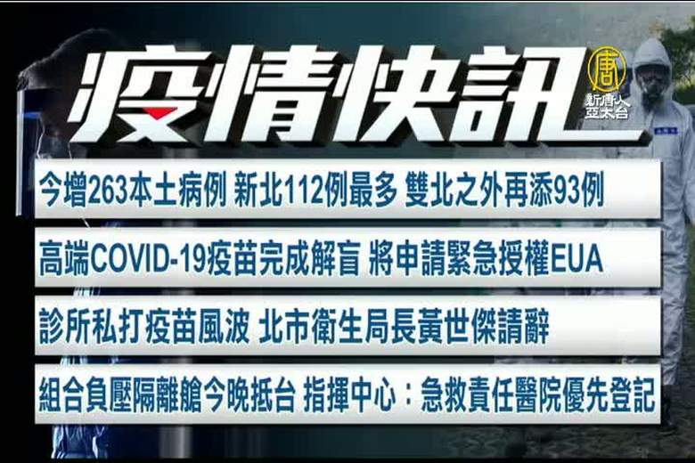 來看到今天的疫情快訊。今天新增263本土病例,新北112例最多,雙北之外再添93例。高端COVID-19疫苗完成解盲,將申請緊急授權EUA。診所私打疫苗風波,北市衛生局長黃世傑請辭。組合負壓隔離艙今天晚間抵台,指揮中心表示:急救責任醫院優先登記。 //asset1.ntdtv.com.tw/public/uploads/assets/2021/06/10/2021-06-10-60c202bd97efb.mp4 高端疫苗|解盲|疫苗|黃世傑|請辭|確診|負壓隔離艙|中共肺炎|武漢肺炎|疫情|防疫|中共病毒|新型冠狀病毒2021-06-10 20:12:53