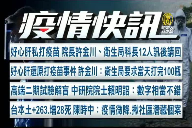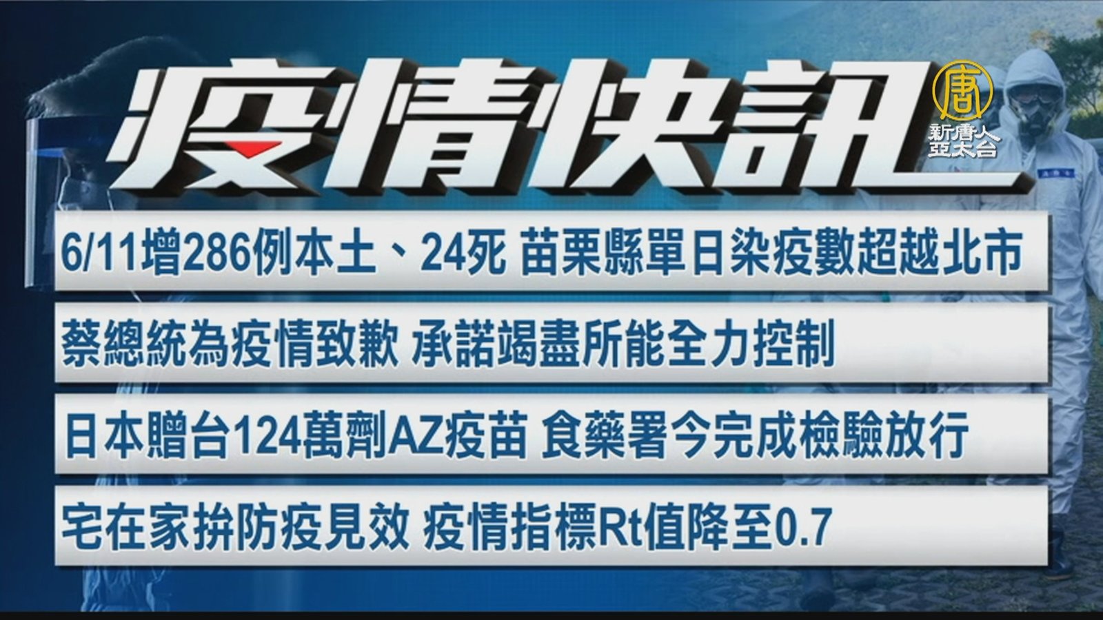 來看到今天的疫情動態。今天增286例本土、24死,苗栗縣單日染疫數,超越北市。蔡總統為疫情致歉,承諾竭盡所能全力控制。日本贈台124萬劑AZ疫苗,食藥署今天完成檢驗放行。宅在家拚防疫見效,疫情指標Rt值降至0.7。 //asset1.ntdtv.com.tw/public/uploads/assets/2021/06/11/2021-06-11-60c355bcadf30.mp4 苗栗|確診|AZ疫苗|蔡英文|Rt值|中共肺炎|武漢肺炎|疫情|防疫|中共病毒|新型冠狀病毒2021-06-11 20:21:23