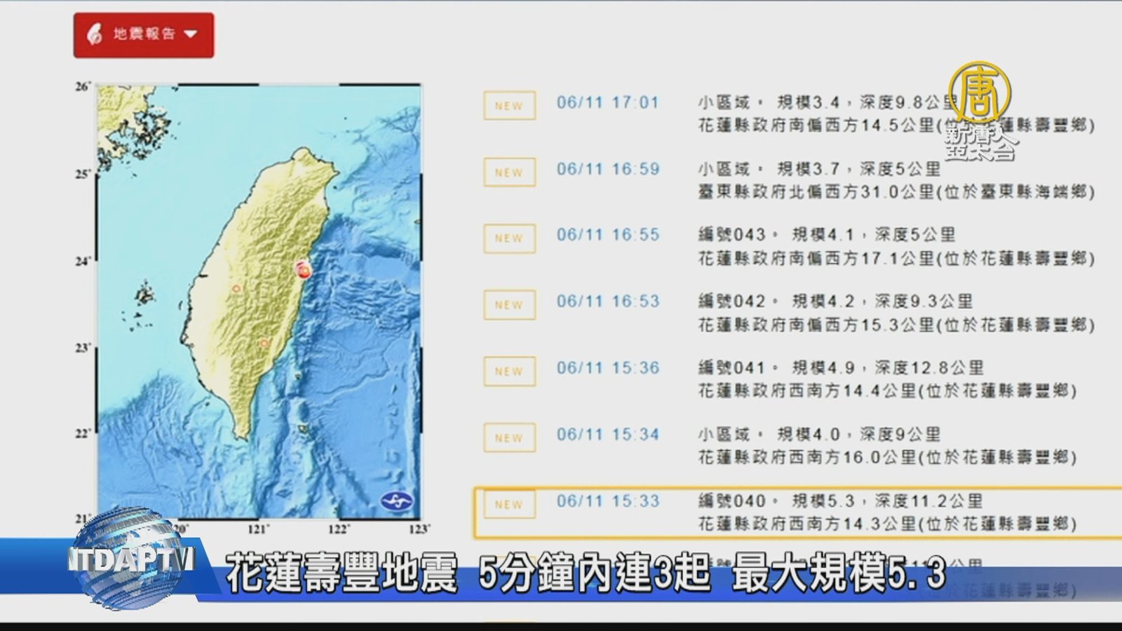花蓮壽豐地震 5分鐘內連3起 最大規模5.3