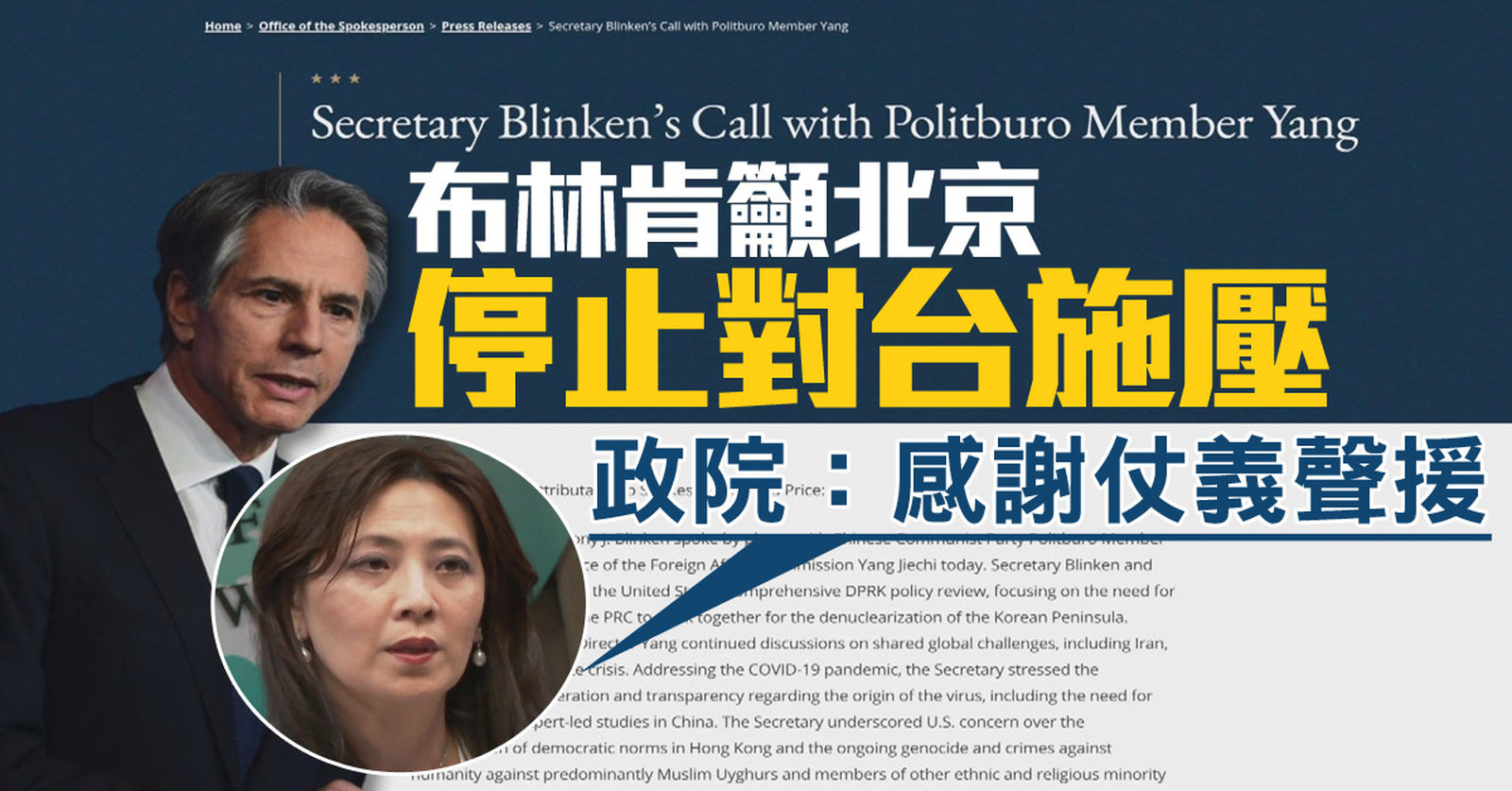 布林肯籲北京停止對台施壓 政院:感謝仗義聲援