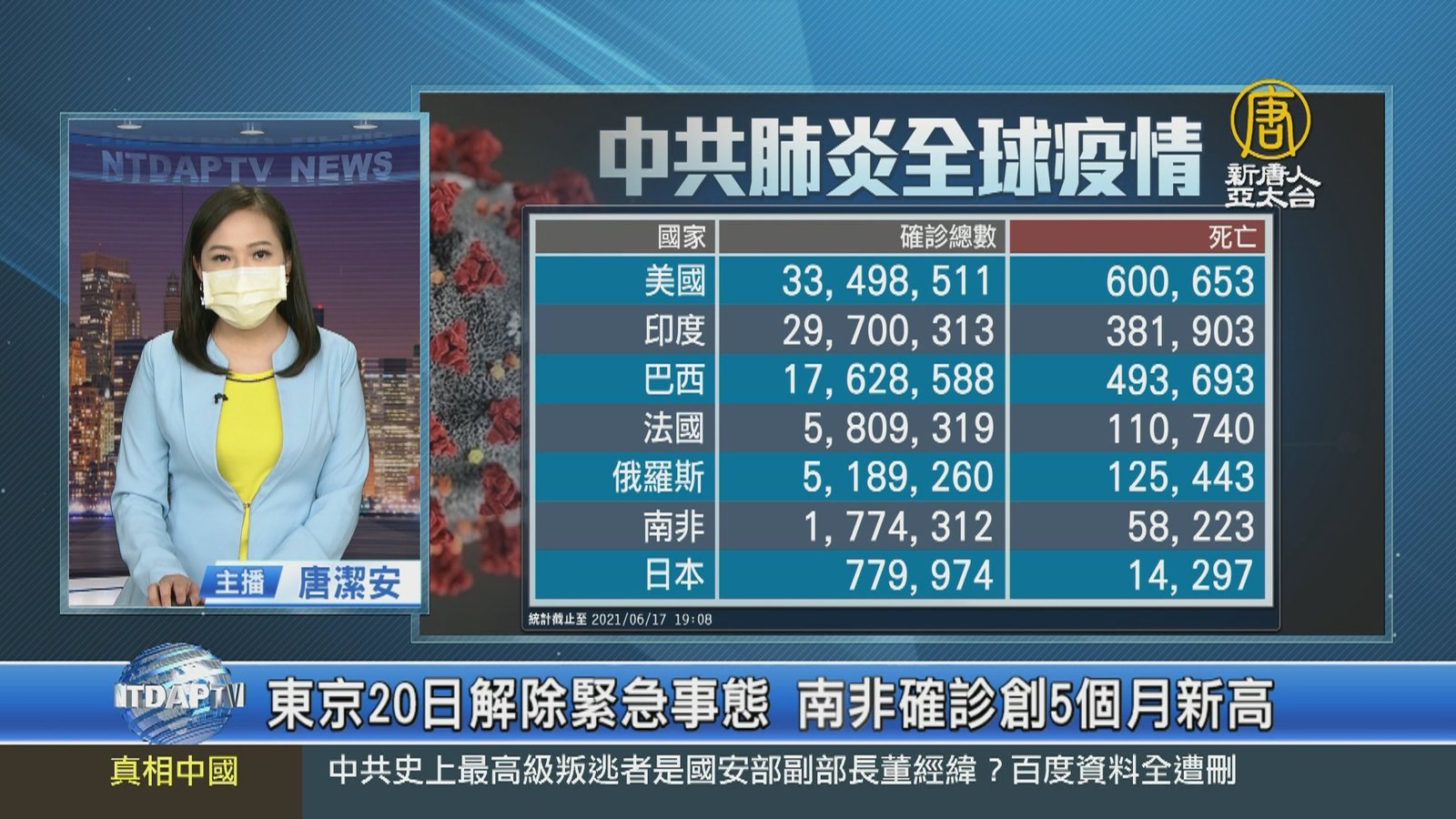 來關心中共肺炎疫情最新情況,全球確診超過1億7千704萬人,死亡3百83萬3千多人。但中共、伊朗等國家,被認為嚴重低報數據。亞洲方面,印度單日新增確診超過6萬7千例,死亡增加2千3百多人。日本針對東京等10都道府縣發布的緊急事態宣言,預定實施到20日,但其中疫情較嚴峻的沖繩縣,將延長實施到7月11日。南美洲的巴西,新增確診超過9萬5千例,死亡增加將近3千人。非洲國家南非,新增確診1萬3千多例,創下5個月以來的單日新高,也比前一天大幅增加近5千例。 //asset1.ntdtv.com.tw/public/uploads/assets/2021/06/17/2021-06-17-60cb3f7bf337f.mp4 印度|確診|日本|沖繩|緊急事態宣言|巴西|南非|中共肺炎|武漢肺炎|疫情|防疫|中共病毒|新型冠狀病毒2021-06-17 20:24:37