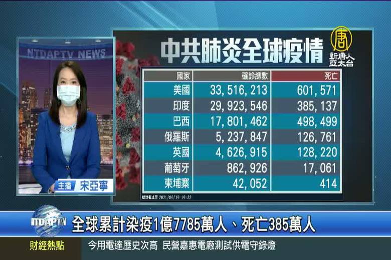 再來關心中共肺炎動態,目前全球公開數據,累計確診 1億7千7百85萬人,累計死亡 385萬人。其中,中共、伊朗等政權,被認為嚴重低報數據。美國目前累計 3千3百51萬人確診,60.1萬人死亡。印度新增確診 6萬人、死亡 1千6百多人,累計 2千9百82萬人確診,38.5萬人死亡。巴西過去一周,平均每天 2千人死亡,佔全球總數的五分之一,專家警告可能有下一波疫情。俄羅斯首都莫斯科,新增 9千例確診,創下新高。英國新增 1萬例確診,其中 99%是印度變種病毒。葡萄牙新增 1千3百例確診,創下3月以來新高;柬埔 //asset1.ntdtv.com.tw/public/uploads/assets/2021/06/19/2021-06-19-60cde72cb43a3.mp4 美國|印度|巴西|俄羅斯|柬埔寨|中共肺炎|武漢肺炎|疫情|防疫|中共病毒|新型冠狀病毒2021-06-19 20:46:03