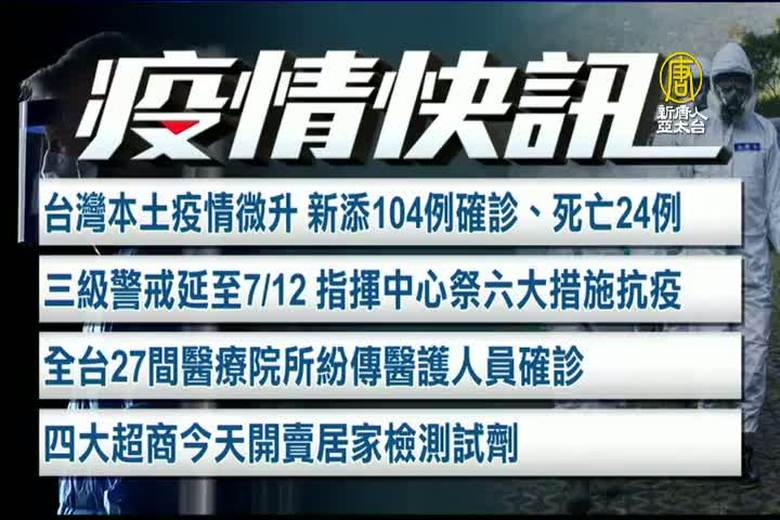 來看到一組台灣疫情訊息。今天本土疫情微升,新添104例確診、24例死亡。三級警戒延至7月12日,指揮中心祭出六大措施抗疫。全台有27間醫療院所紛傳醫護人員確診。四大超商今天開賣居家檢測試劑。 //asset3.ntdtv.com.tw/public/uploads/assets/2021/06/23/2021-06-23-60d32621cbd03.mp4 確診|三級警戒|延期|醫護人員|居家檢測試劑|中共肺炎|武漢肺炎|疫情|防疫|中共病毒|新型冠狀病毒2021-06-23 20:12:41