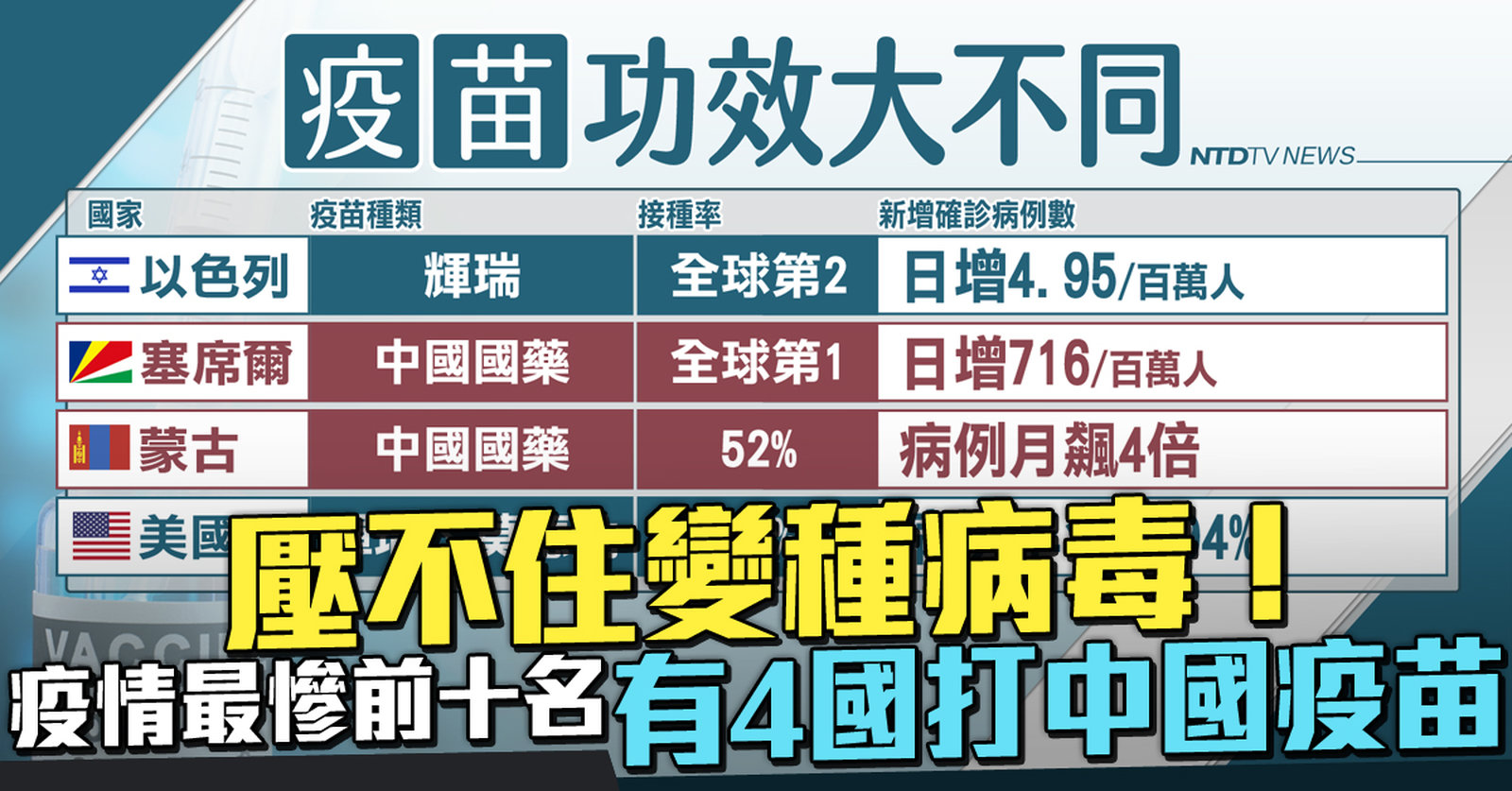 中共推動疫苗外交,不過外媒報導,多個依賴中國疫苗的國家,不但無法從疫情解脫,反而感染激增,包括塞席爾、智利、巴林與蒙古,施打中國科興和國藥疫苗,接種率高於美國,卻全都名列上週全球疫情最嚴重的10大國家。港大研究也發現,科興疫苗抗體水平過低,可能驗不出來。 //asset2.ntdtv.com.tw/public/uploads/assets/2021/06/23/2021-06-23-60d329a155931.mp4 中共肺炎|武漢肺炎|疫情|防疫|中共病毒|新型冠狀病毒|變種病毒|抗體|科興|國藥|蒙古|巴林|塞席爾|巴西2021-06-23 21:16:58