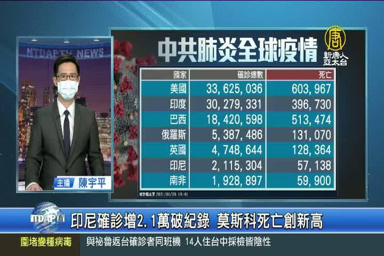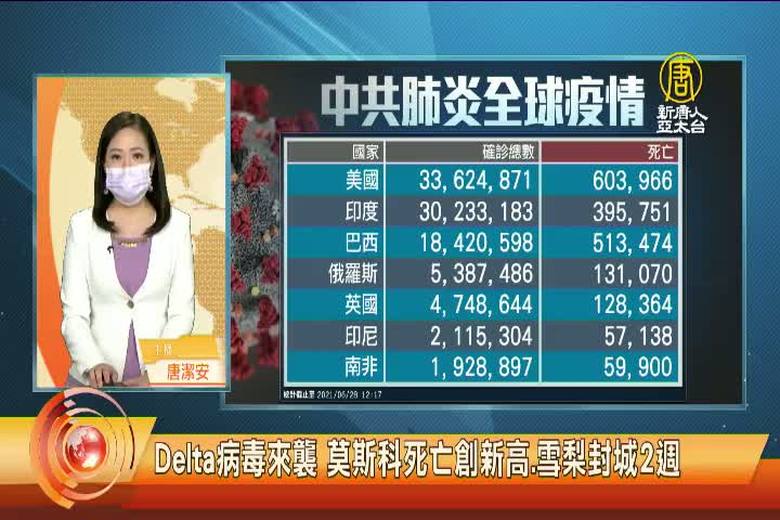 再來關心全球疫情最新情況,全球確診超過1億8千110萬人,死亡3百92萬3千多人。但中共、伊朗等國家,被認為嚴重低報數據。亞洲方面,印度單日新增超過4萬6千人確診和979人死亡。印尼27日新增2萬1千多例確診,改寫單日最高紀錄。俄羅斯因為Delta變種病毒導致染疫人數激增,莫斯科27日單日新增144例死亡創新高。為了防堵Delta變種病毒,孟加拉全國封城7天,非洲國家南非也重新實施兩週的防疫限制措施。 //asset2.ntdtv.com.tw/public/uploads/assets/2021/06/28/2021-06-28-60d9cc9f364c8.mp4 印度|俄羅斯|莫斯科|確診|死亡|印尼|孟加拉|Delta變種病毒|封城|南非|中共肺炎|武漢肺炎|疫情|防疫|中共病毒|新型冠狀病毒2021-06-28 21:20:31