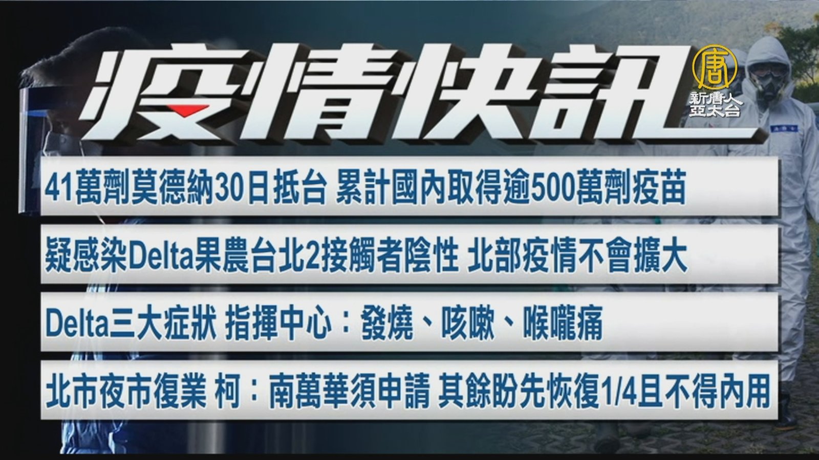 來看到今天的疫情快訊。41萬劑莫德納30日抵台,累計台灣已經取得超過500萬劑疫苗。指揮官陳時中今天表示:疑似感染Delta果農台北2名接觸者都是陰性,北部疫情確定不會擴大。指揮中心今天指出Delta三大症狀:發燒、咳嗽、喉嚨痛。北市夜市復業情況,市長柯文哲指示:南萬華須申請,其餘盼先恢復1/4且不得內用。 //asset1.ntdtv.com.tw/public/uploads/assets/2021/06/28/2021-06-28-60d9bea37607c.mp4 莫德納|疫苗|確診|中共肺炎|武漢肺炎|疫情|防疫|中共病毒|新型冠狀病毒2021-06-28 20:17:57