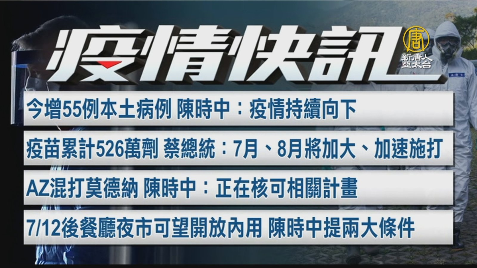 來看到今天的一組疫情簡訊。今天新增55例本土病例,指揮官陳時中認為:疫情持續向下。疫苗累計526萬劑,蔡總統指出:7月、8月將加大、加速施打。AZ混打莫德納,指揮中心表示目前正在核可相關計畫。7月12日後餐廳夜市可望開放內用,陳時中也提出兩大條件。 //asset1.ntdtv.com.tw/public/uploads/assets/2021/06/30/2021-06-30-60dc61fe656c1.mp4 疫苗|中共肺炎|武漢肺炎|疫情|防疫|中共病毒|新型冠狀病毒2021-06-30 20:21:33