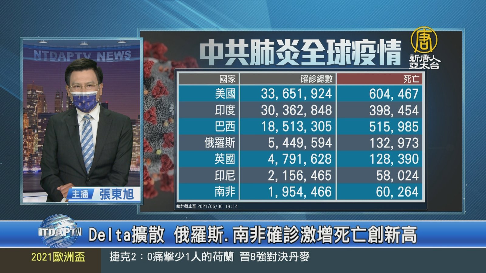 來關心中共肺炎疫情最新情況,全球確診超過1億8千181萬人,死亡將近3百93萬8千人。但中共、伊朗等國家,被認為嚴重低報數據。亞洲方面,俄羅斯因為Delta變種病毒導致染疫人數激增,29日新增確診2萬多人,死亡增加652人,創下自疫情爆發以來單日死亡新高紀錄。印尼過去6天有5天單日超過2萬人確診,29日新增463人死亡,是疫情後次高紀錄。泰國單日新增4千7百多人確診,53例死亡,創下單日死亡新高,累計死亡數突破兩千人。非洲疫情最嚴重的南非,同樣因Delta變異株導致確診病例激增,染疫死亡人數跨越6萬大關。 //asset3.ntdtv.com.tw/public/uploads/assets/2021/06/30/2021-06-30-60dc655e1b9cc.mp4 俄羅斯|確診|死亡|Delta變種病毒|印尼|南非|泰國|中共肺炎|武漢肺炎|疫情|防疫|中共病毒|新型冠狀病毒2021-06-30 20:35:00