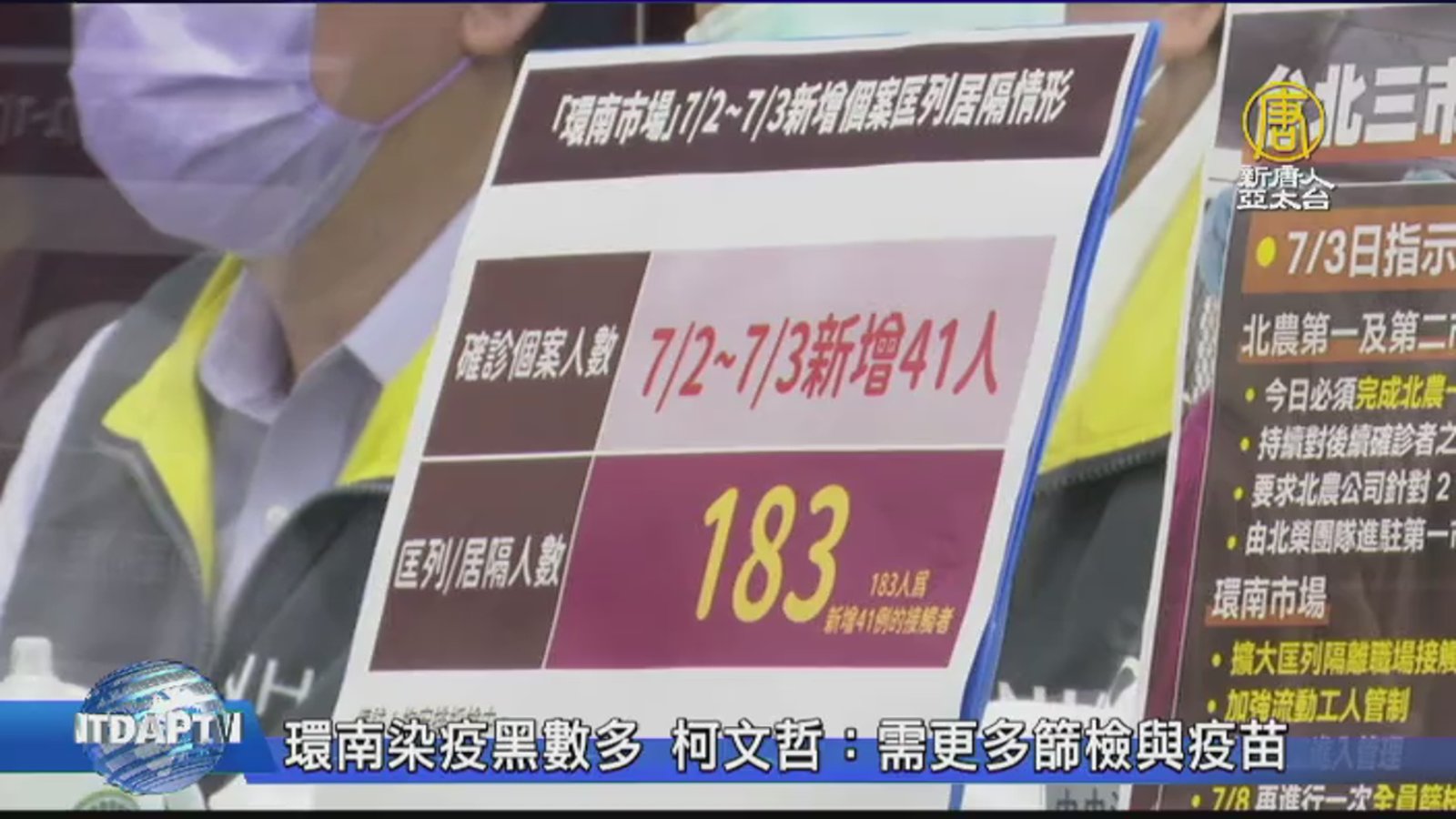 台北環南市場群聚,驗出40多人,台北市長柯文哲說,確診只有5人出現症狀送醫,其他都是無症狀,認為感染黑數病例多,要採取大量篩檢與廣泛打疫苗的策略。 //asset3.ntdtv.com.tw/public/uploads/assets/2021/07/03/2021-07-03-60e0573d88490.mp4 中共肺炎|武漢肺炎|疫情|防疫|環南|柯文哲2021-07-03 20:24:35
