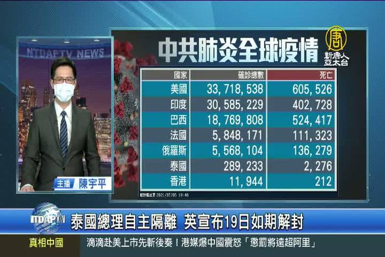 再來關心中共肺炎動態,目前全球公開數據,累計確診 1億8千3百82萬人,累計死亡 397萬人。美國目前累計 3千3百71萬人確診,60.5萬人死亡。印度新增近 4萬人確診、死亡 723人。僅管英國每天仍有近3萬人確診,但是英國政府決定19日如期解除封鎖措施,呼籲民眾「學習與病毒共存」。巴西新增 2.7萬人確診、830死亡。另外,泰國總理帕若育因為身邊人士確診,目前他已自主隔離。香港連續 28天沒有本土感染,累計確診 1萬1千943人,死亡 212人。但香港日前一名確診變種病毒的印度裔男子,以及他的菲律賓籍 //asset3.ntdtv.com.tw/public/uploads/assets/2021/07/05/2021-07-05-60e306e38ef37.mp4 美國|印度|香港|泰國|中共肺炎|武漢肺炎|疫情|防疫|中共病毒|新型冠狀病毒2021-07-05 21:19:31