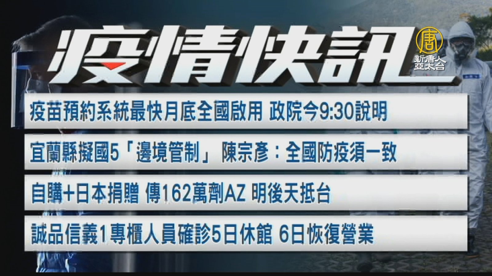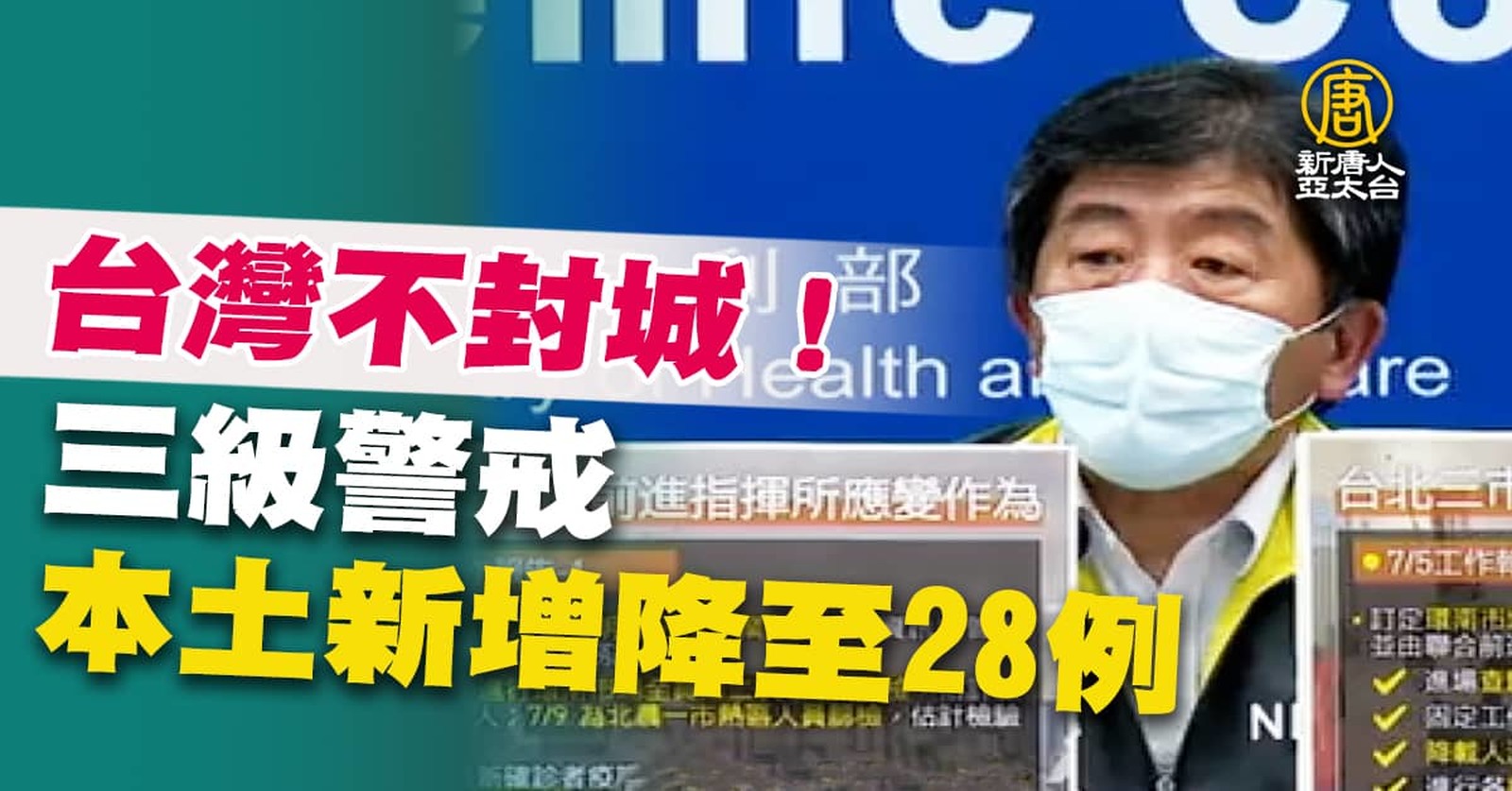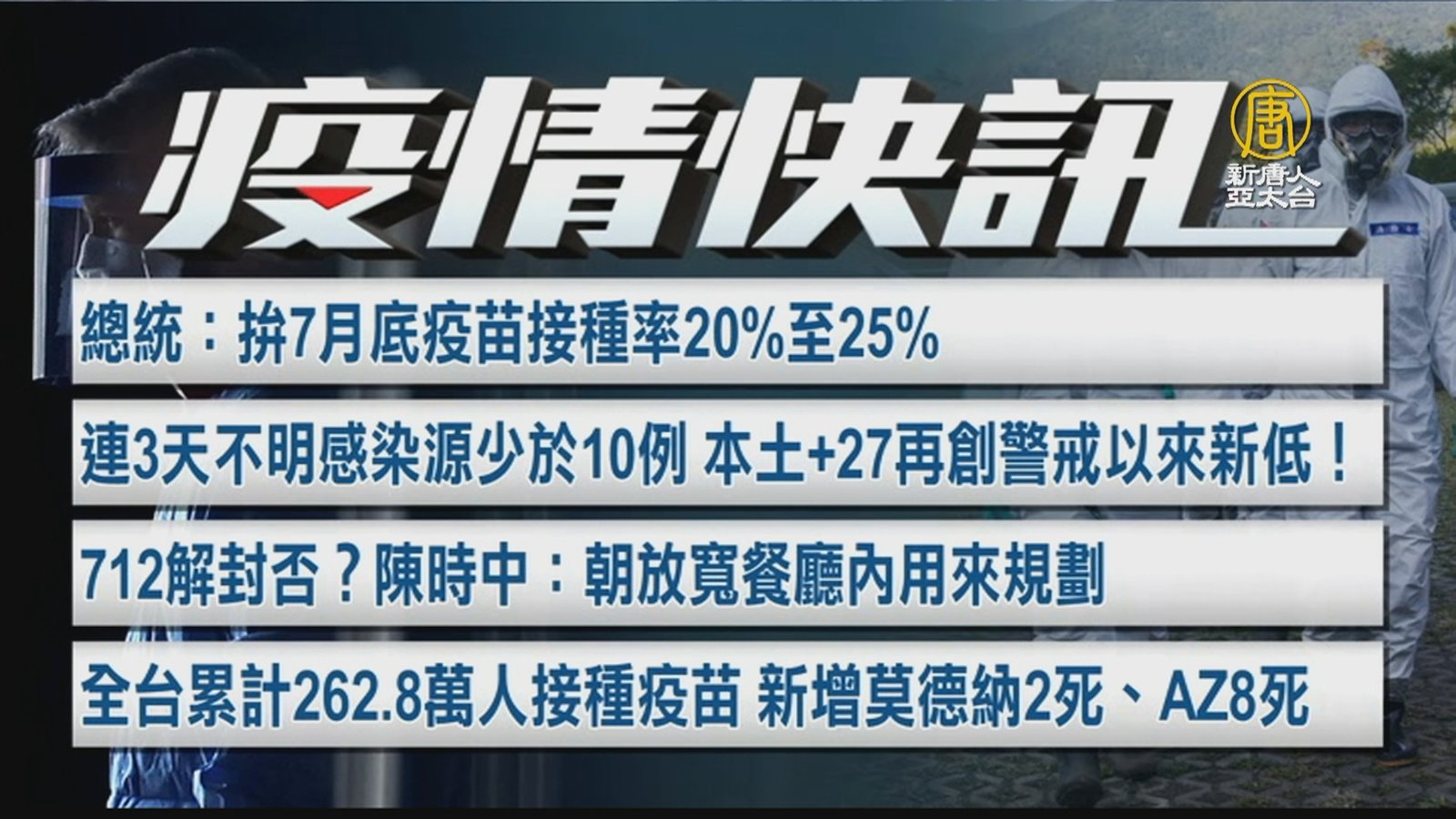 來看今天的疫情快訊。總統今天表示:拚7月底疫苗接種率20%到25%,達到防疫上有意義程度。台灣連3天不明感染源少於10例,本土確診新增27,再創警戒以來新低!712是否解封呢?指揮官陳時中指出:朝放寬餐廳內用來規劃。目前,全台累計有262.8萬人接種疫苗,新增莫德納2人死亡、AZ有8人死亡。 //asset1.ntdtv.com.tw/public/uploads/assets/2021/07/06/2021-07-06-60e44b8366e5b.mp4 疫苗接種率|蔡英文|712解封|餐廳內用|莫德納|AZ|死亡|中共肺炎|武漢肺炎|疫情|防疫|中共病毒|新型冠狀病毒2021-07-06 20:20:14