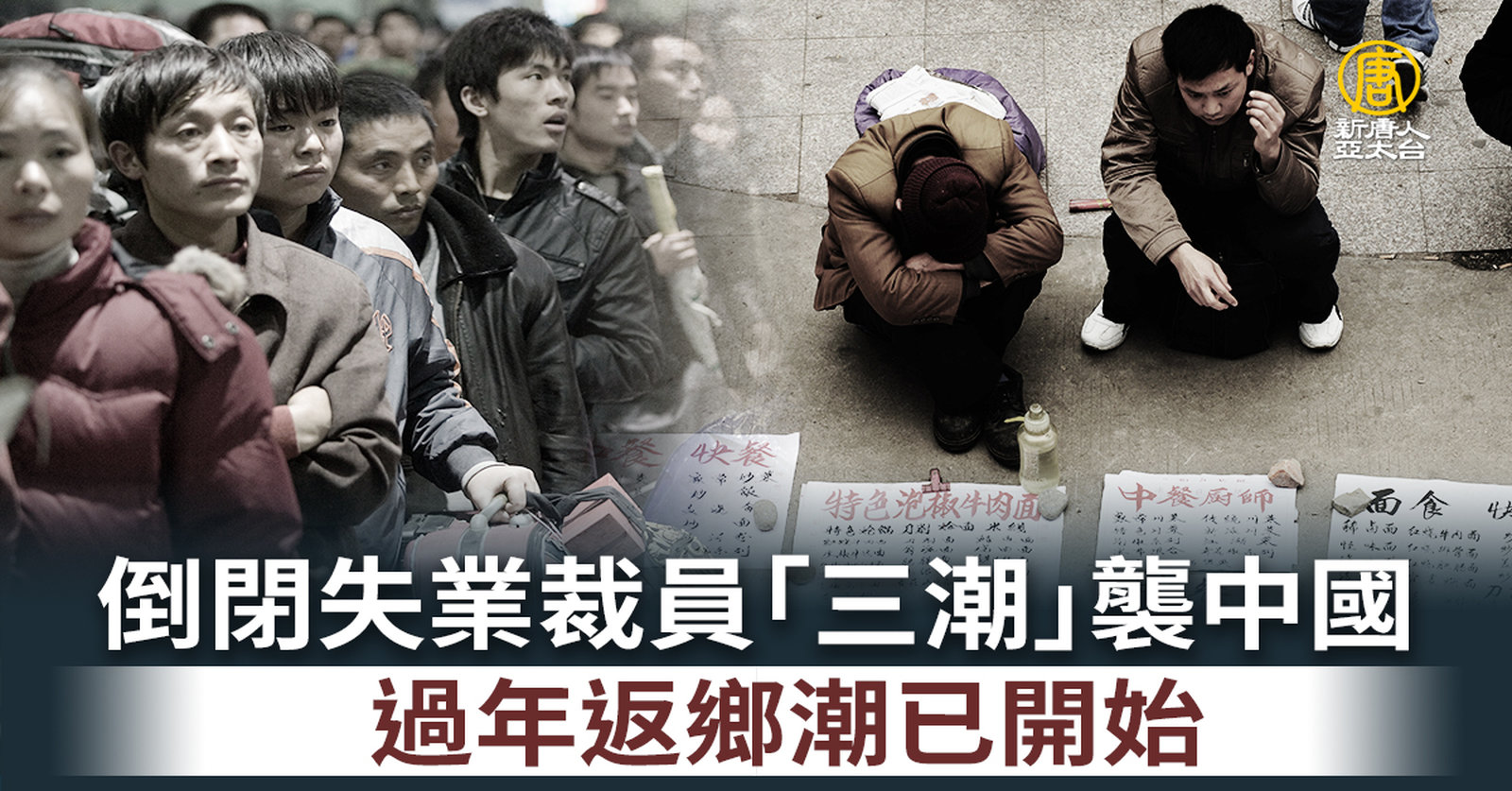 中國疫情再升溫,工業重鎮「珠三角」地區多地出現企業倒閉潮、裁員潮、失業潮,三大衝擊下,今年返鄉潮比往常提前四個月開始。 //asset3.ntdtv.com.tw/public/uploads/assets/2023/11/29/2023-11-29-6567230f0c8a7.mp4 中國疫情|珠三角|企業倒閉|裁員潮|失業|返鄉潮2023-11-29 19:37:38
