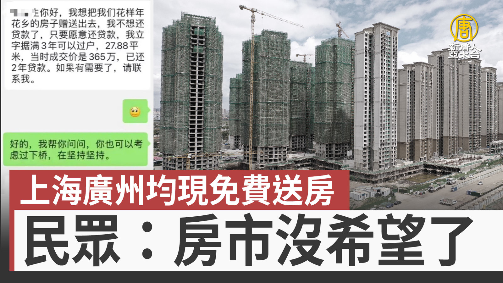 近日,上海、廣州等中國一線城市,都有業主在網上張貼廣告,免費送房。分析指出,中國房價一路狂跌,業主看不到房市復甦的希望,不得不虧錢轉讓。 //asset2.ntdtv.com.tw/public/uploads/assets/2023/12/06/2023-12-06-65705dea39e86.mp4 中國房市|房價|免費送房|房地產|中國經濟|房價暴跌|房貸2023-12-06 19:37:13