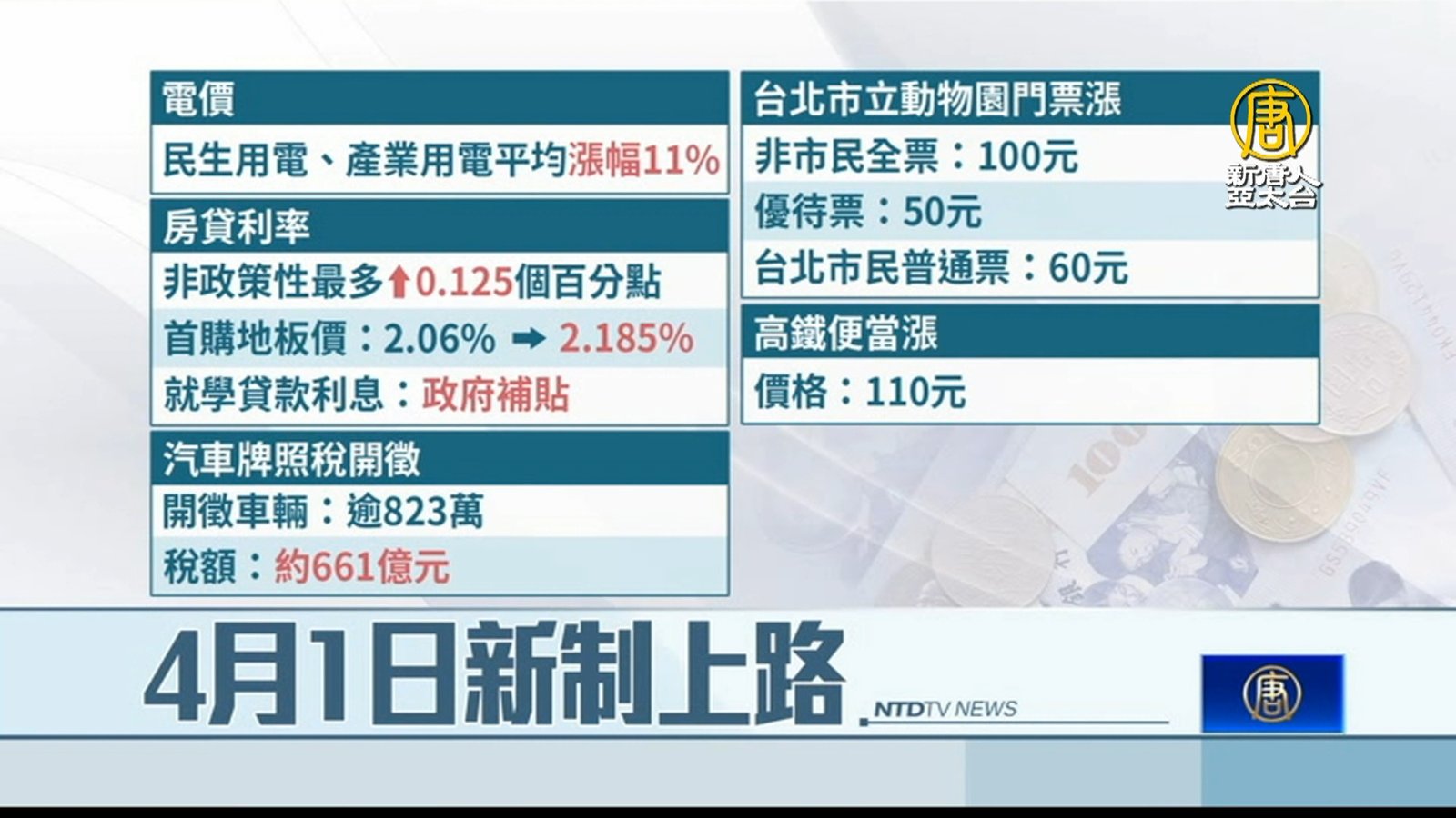 台灣從今天4月1日起調漲電價。4月還有哪些新制上路,帶您了解。 //asset2.ntdtv.com.tw/public/uploads/assets/2024/04/01/2024-04-01-660a9841cddcf.mp4 電假|新制|汽車牌照稅|房貸利率2024-04-01 21:02:20