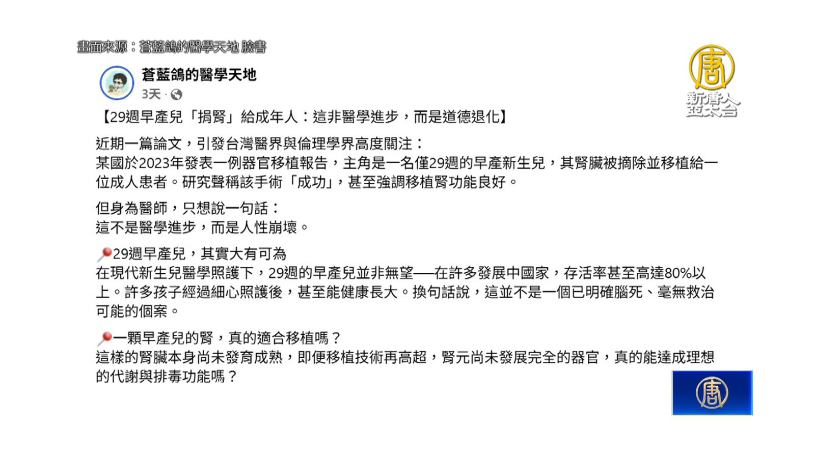 中共活摘器官,在台灣引起輿論高度關注,多位台灣醫生指出中國器官移植的不合理,尤其對於對岸使用早產兒器官移植表達憤怒。今天(16日)上午,台大醫院院長吳明賢也發聲。 //www.ntdtv.com.tw/public/uploads/assets/2025/04/16/2025-04-16-67ff9c884facc-220x123-169.jpg 活摘器官|國有器官|台大醫|早產兒2025-04-16 20:13:44