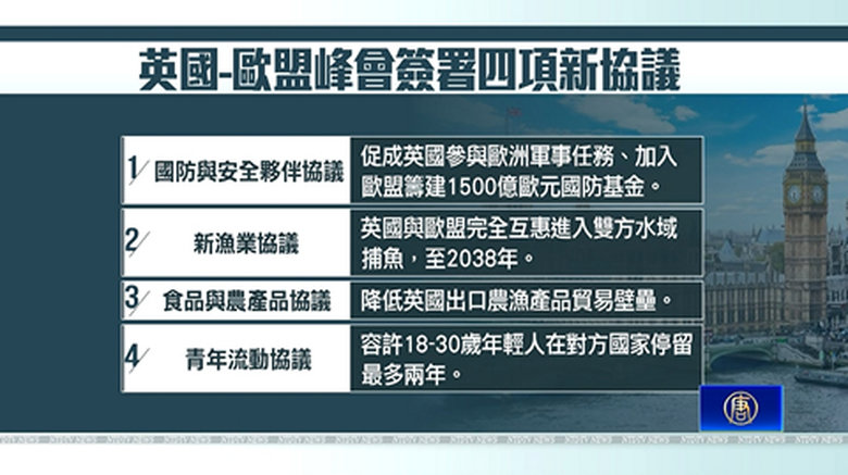 新聞首先來看到,睽違五年,英國脫歐後首度與歐盟舉行峰會,雙方將達成安全與國防夥伴協議、歐盟-英國團結聲明,以及關於貿易、漁業和青年流動等議題的共同諒解,為重啟關係鋪路。 //www.ntdtv.com.tw/public/uploads/assets/2025/05/19/2025-05-19-682b24b21499b-220x123-480269.jpg 英國|歐盟|脫歐|峰會|施凱爾|范德賴恩2025-05-19 20:34:30